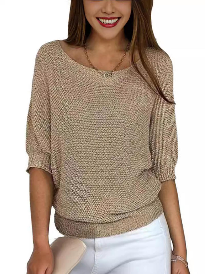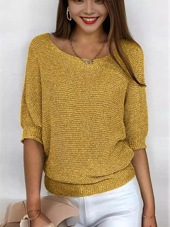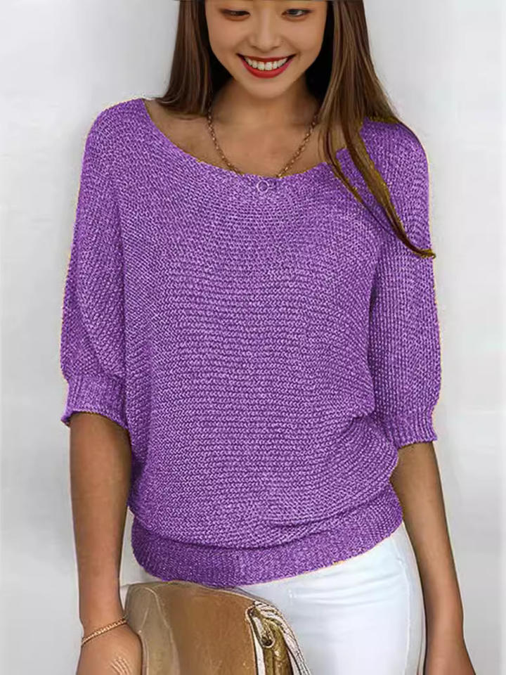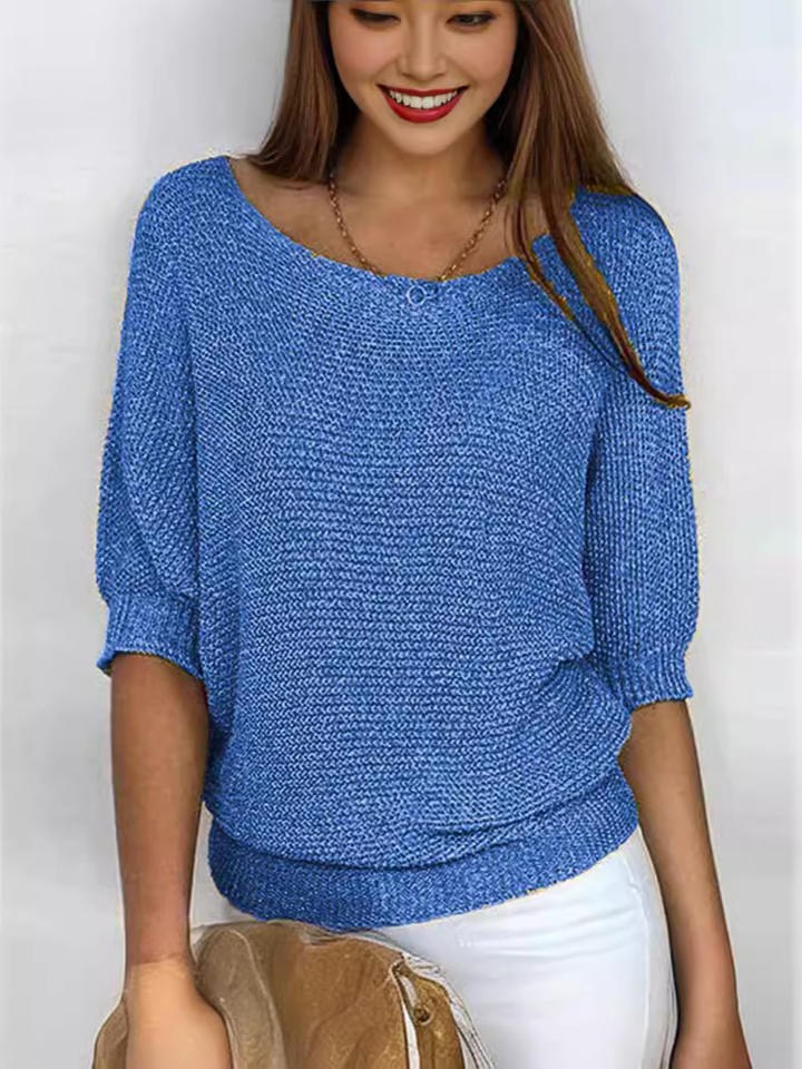 Spring Women's Solid Color Stylish Crew Neck Knit Top Sweater Three Quarter Sleeve Knitwear