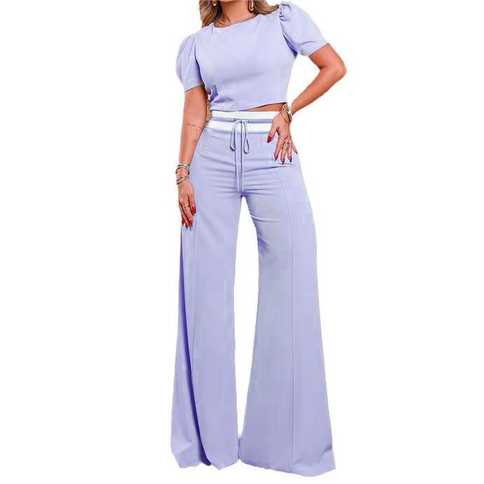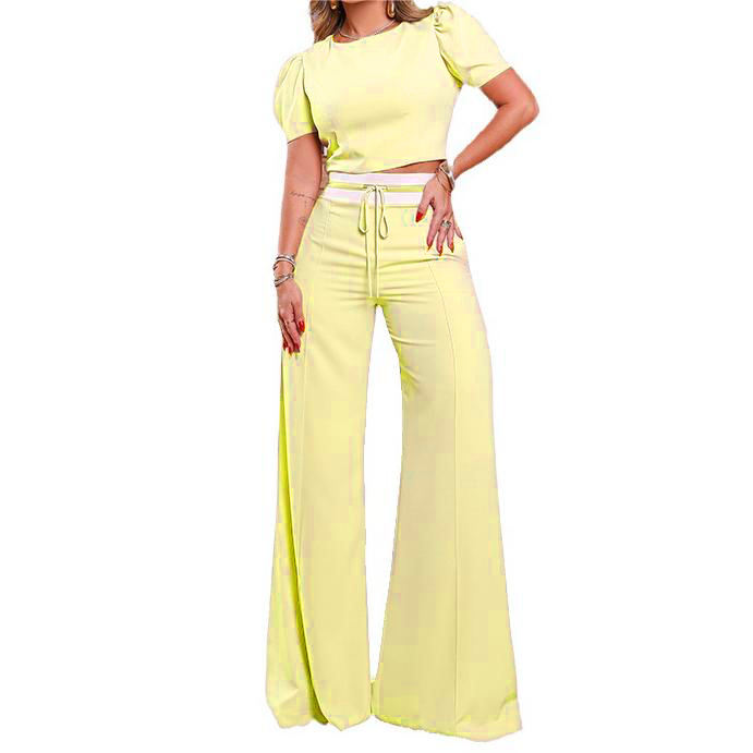 Ensemble 2 pièces décontracté pour femmes, haut à col rond et manches bouffantes, pantalon large à nouer, tendance printemps-été