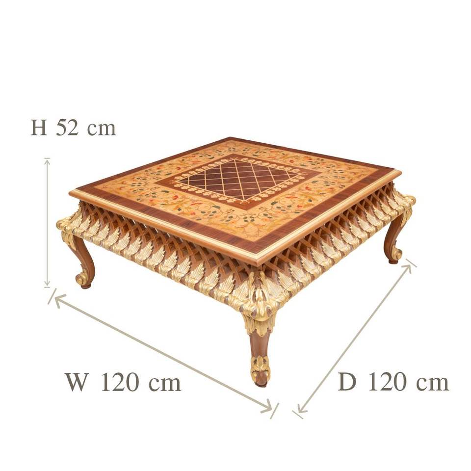 Table basse carrée avec incrustation florale complexe et base en bois sculpté pour une décoration intérieure élégante et intemporelle