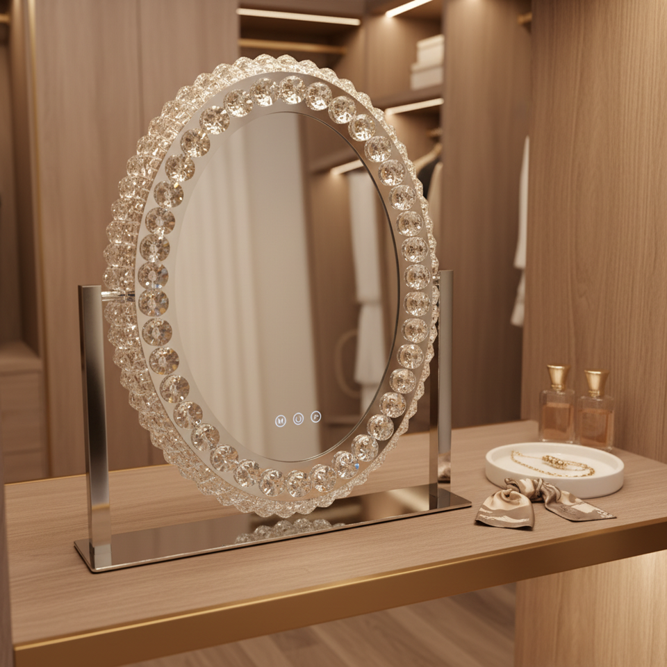 Miroir de maquillage carré de bureau à LED en cristal avec cadre