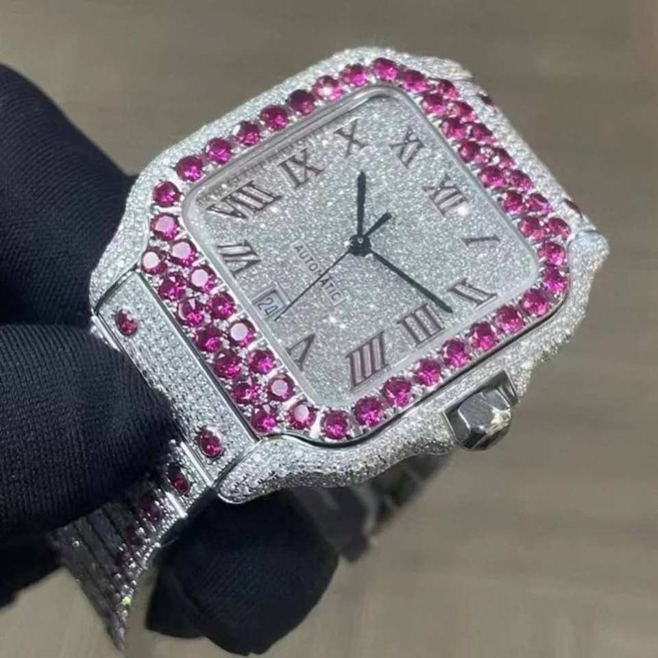 Montre pour homme en acier inoxydable avec chiffres romains carrés, verre de qualité supérieure, sertie de diamants en moissanite rose et blanc, clarté VVS, quartz