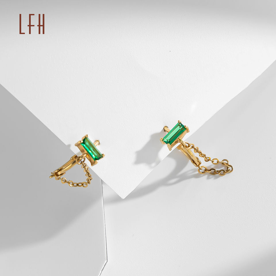 Boucles d'oreilles pendantes en chaîne carrée verte en zircon cubique, or véritable 18 carats, boucles d'oreilles pendantes en chaîne, or pur 18 carats, boucles d'oreilles à clous en zircon, pour femmes