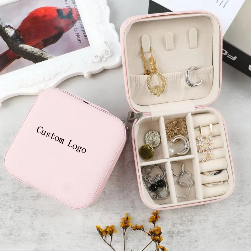 Boîte à bijoux carrée, fermeture à glissière, organisateur de bijoux de voyage multi-compartiments, étui à bijoux gravé sur mesure pour femmes