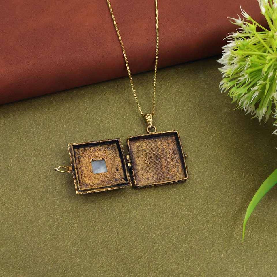 Pendentif médaillon carré style vintage avec pierre précieuse, boîte à prières dorée antique, collier souvenir, cadeau pour elle