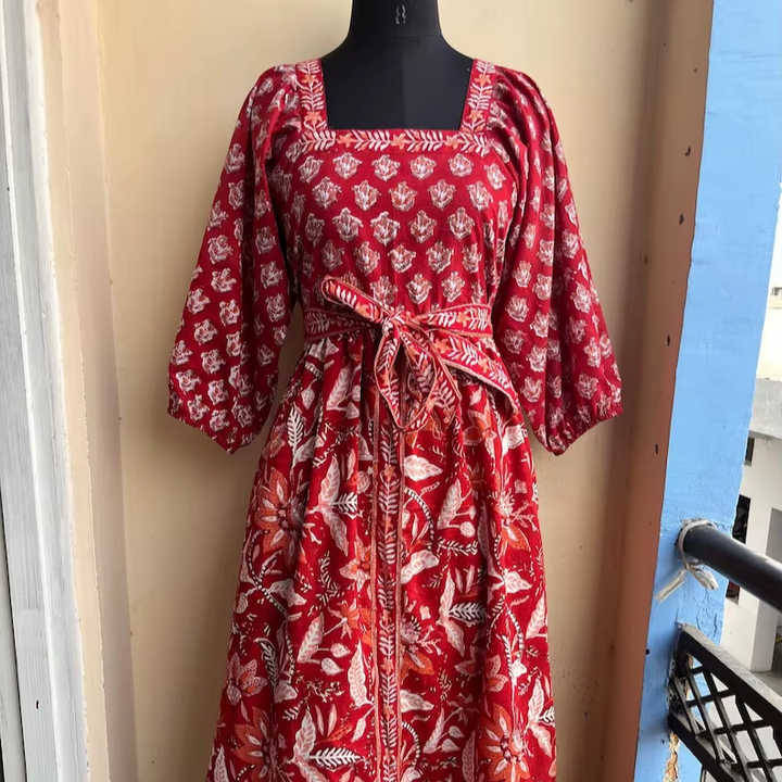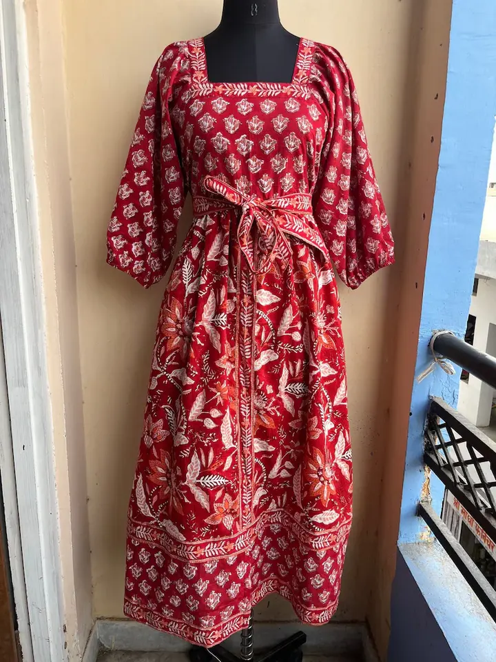 Robe d'été en coton à col rond, taille naturelle, imprimée à la main, longueur genou, avec ceinture, motif floral, écologique, style bohème, coupe ample