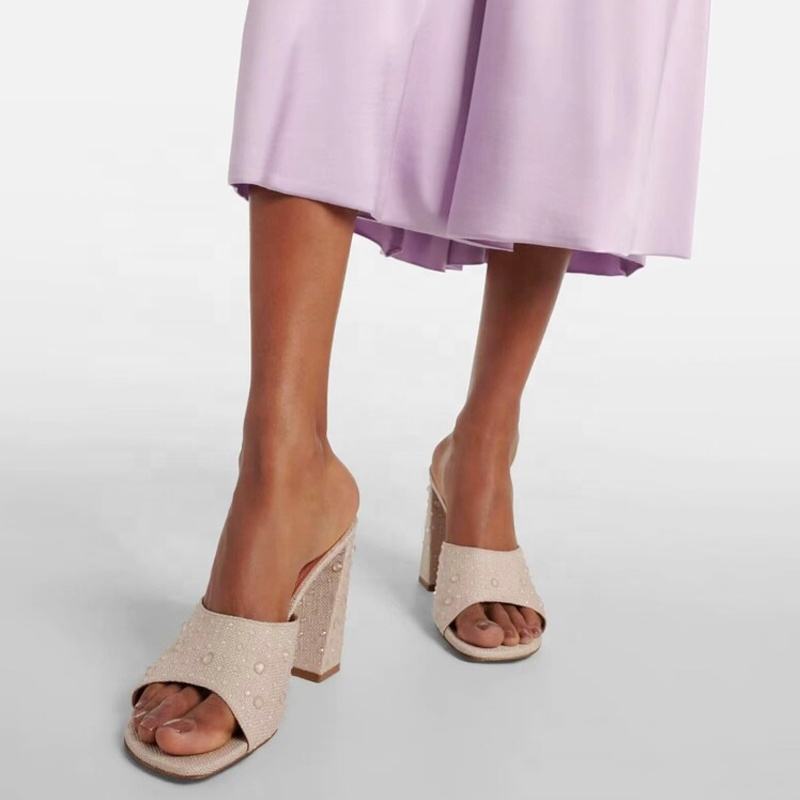 Sandales à talons carrés épais en jean avec strass pour femme, style mules, idéales pour le bureau