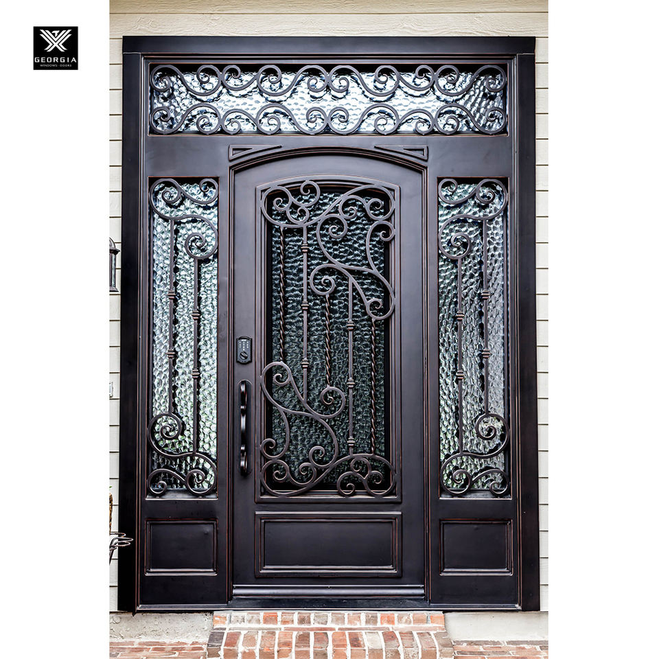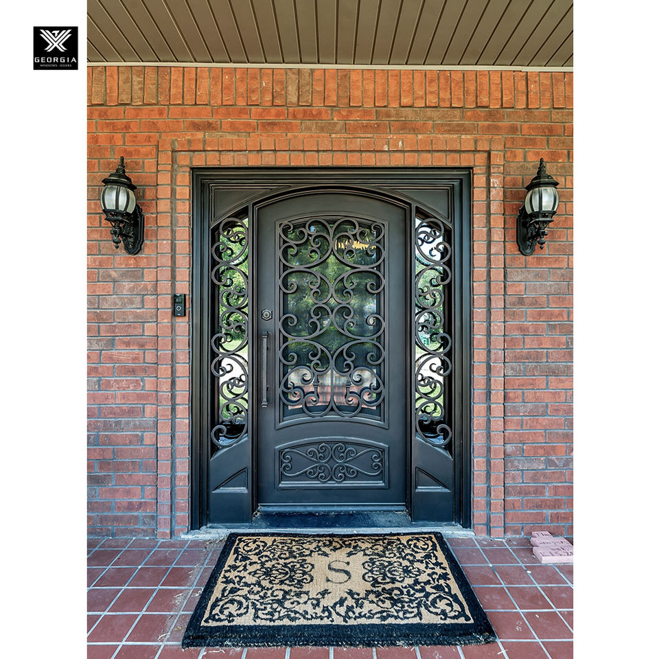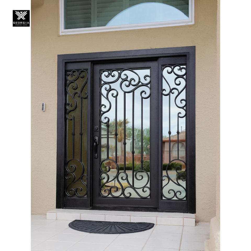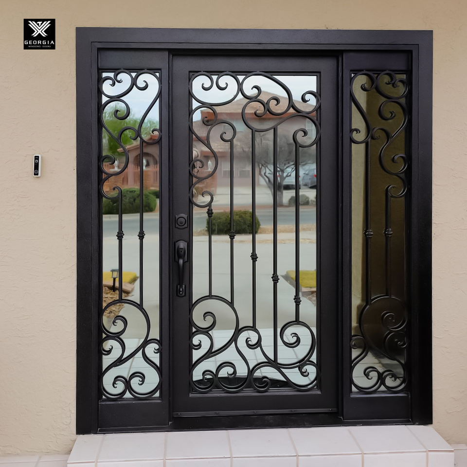 Porte en fer forgé artisanal à ouverture carrée, style Renaissance, avec panneaux latéraux en verre pour maisons de luxe