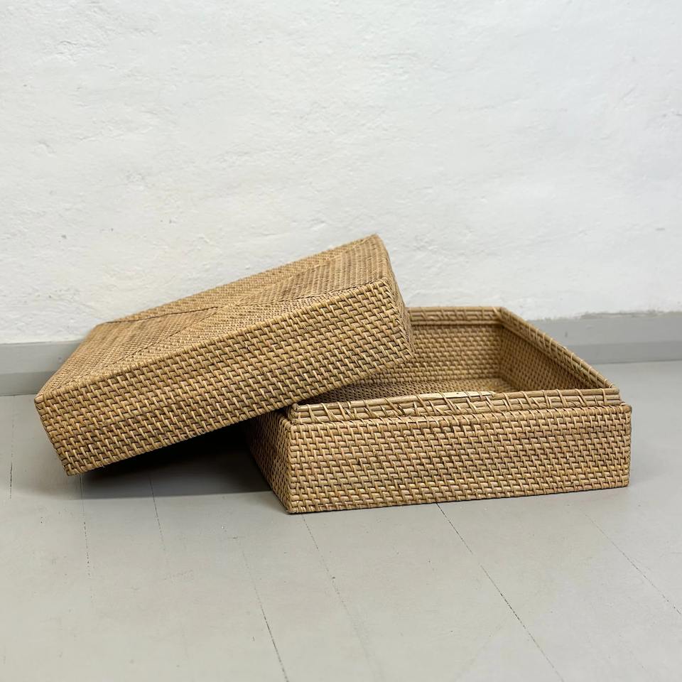 Nom:Boîte de rangement carrée en rotin avec couvercle. Dimensions : L41,5 x H19 cm.