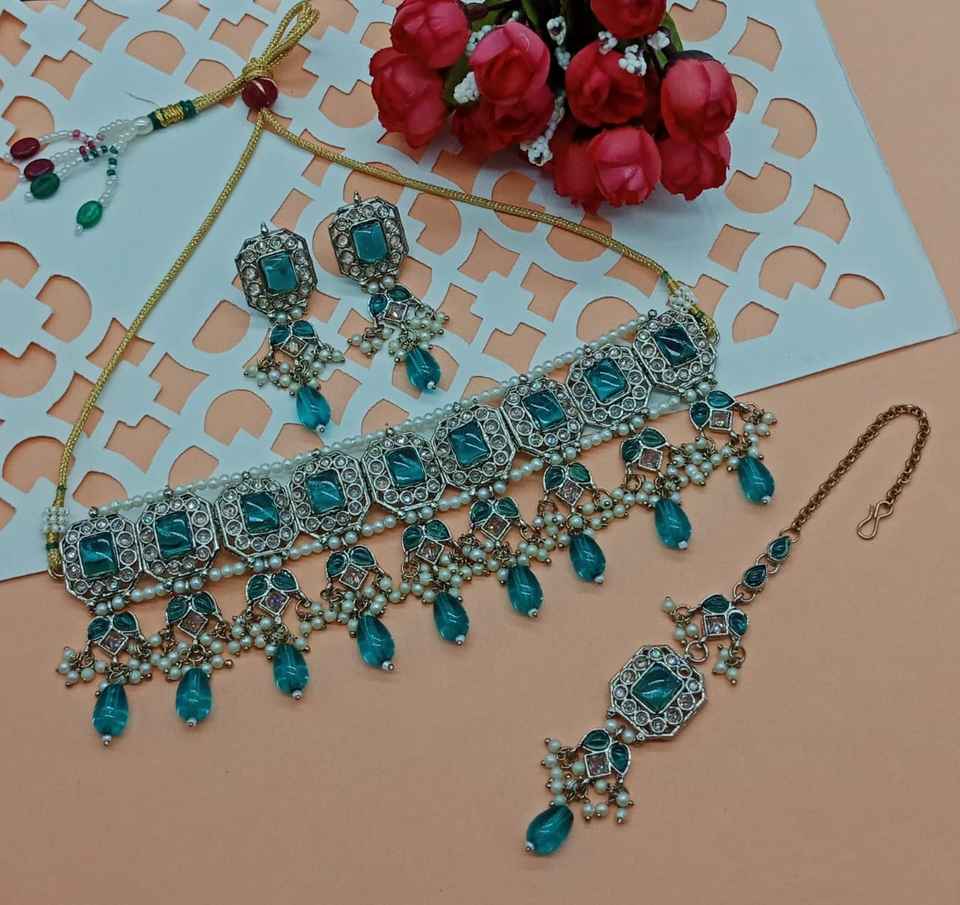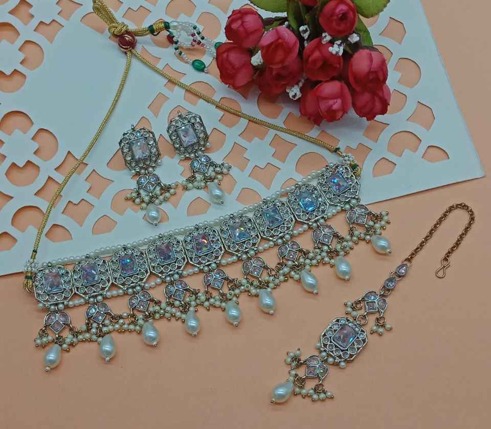 Ensemble de bijoux plaqué or kundan traditionnel indien de forme carrée et collier en cuivre avec ensemble de boucles d'oreilles Mangtika pour femmes