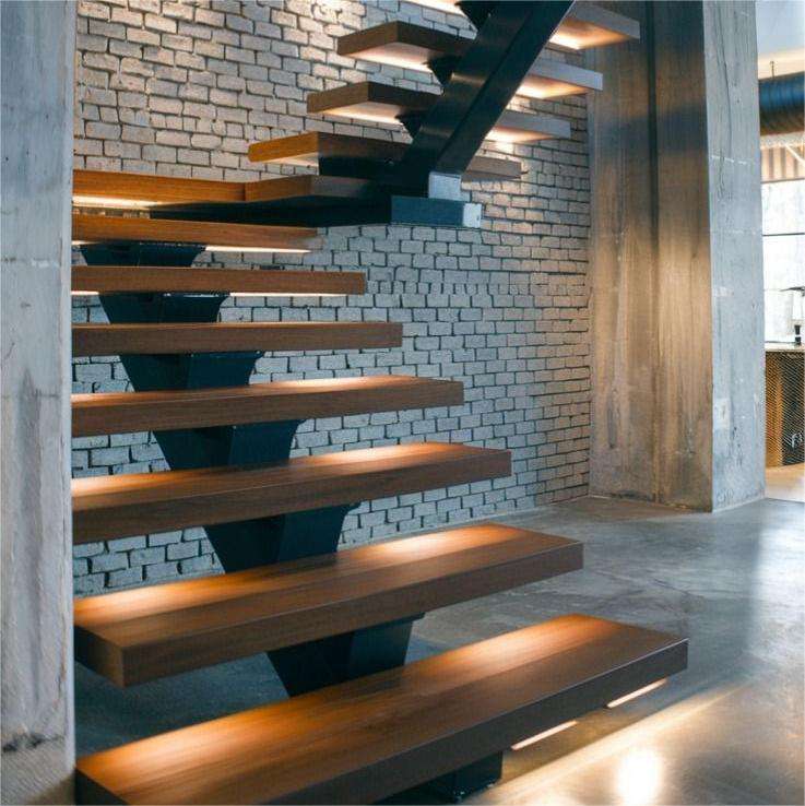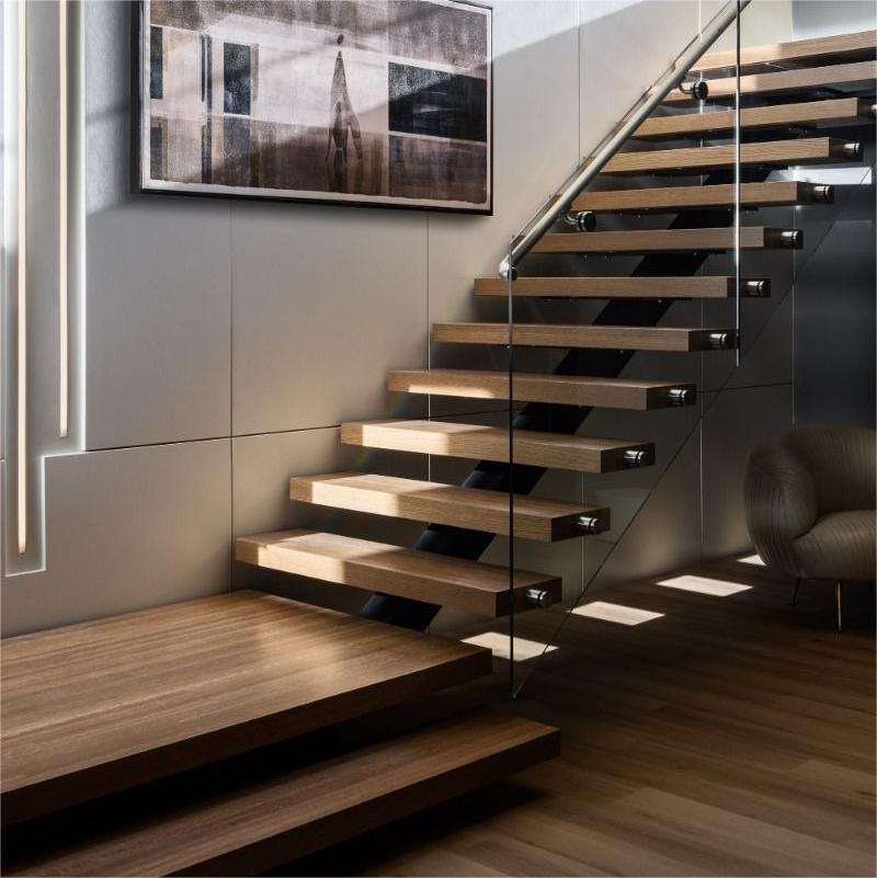 Escalier droit à tube carré Conception flottante à poutre unique Structure métallique Marches en bois Fabriqué sur mesure à Foshan