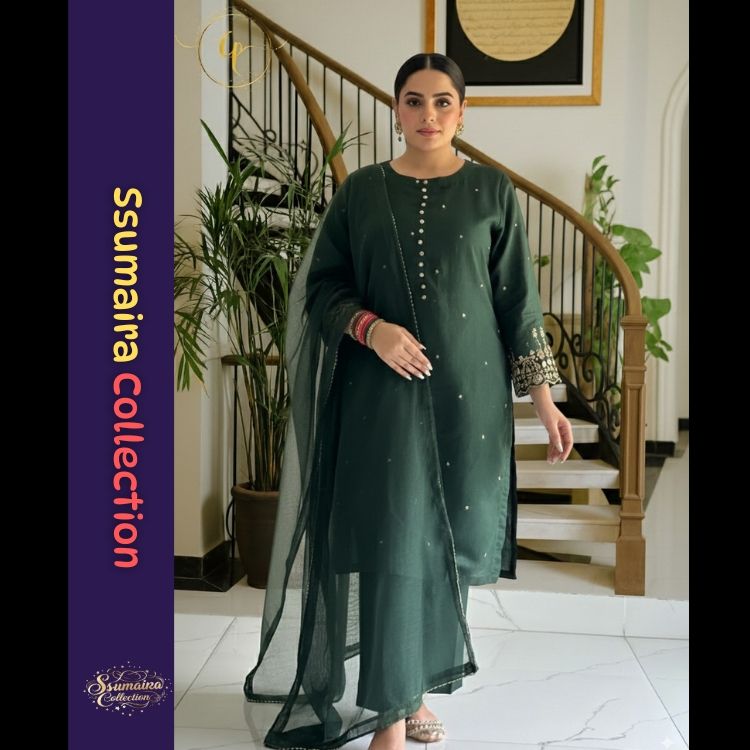 Ssumaira Collection Khadinet Robe brodée 3 pièces couleur vert bouteille-tenue pakistanaise de luxe