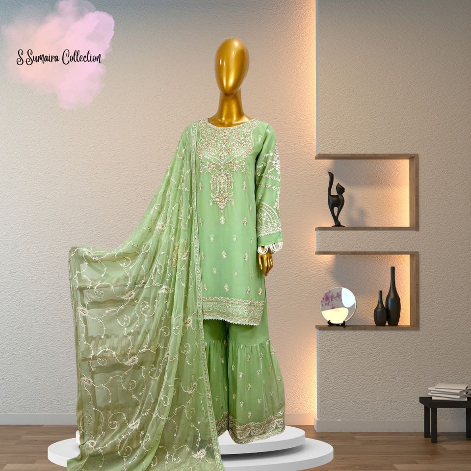 Ensemble 3 pièces en mousseline de soie Lehenga Choli de la collection Ssumaira avec pantalon Gharara
