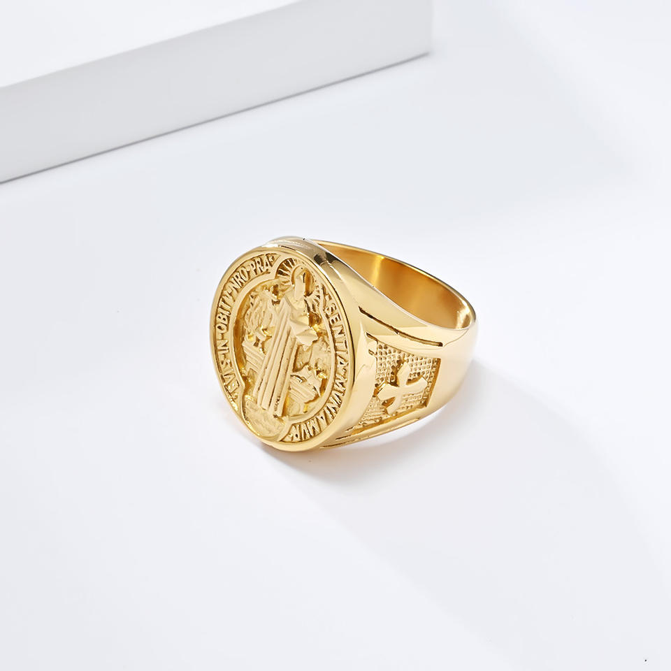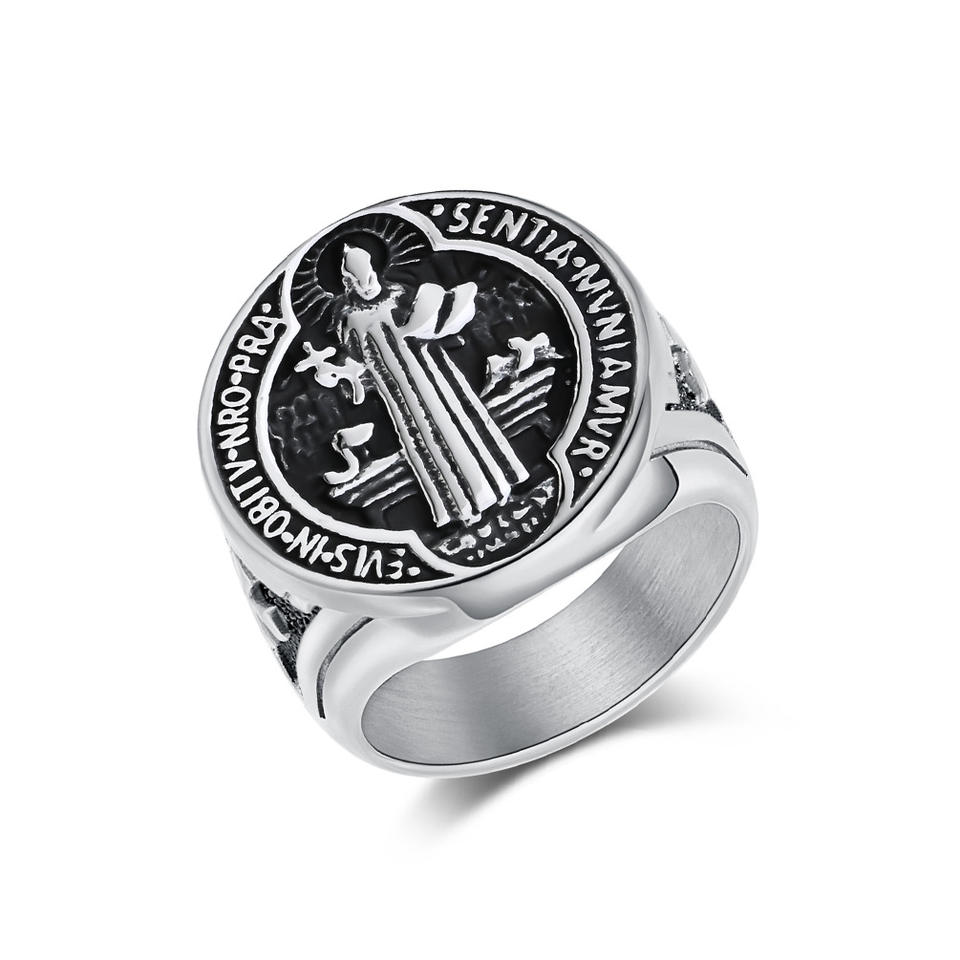 Bague en acier titane avec médaille de Saint Benoît, forme de croix, amulette religieuse, cadeau, bijoux pour homme