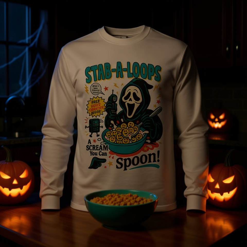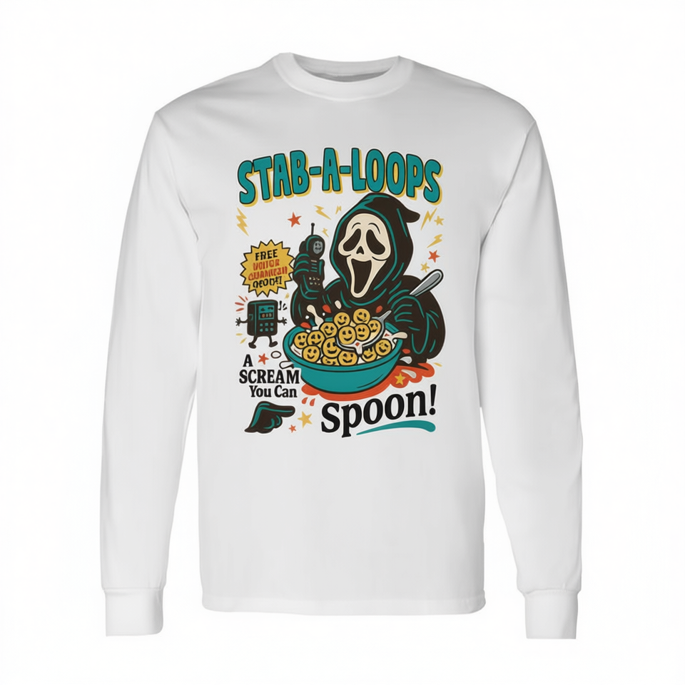 T-shirt à manches longues unisexe pour adulte, col rond, imprimé sérigraphié, motif boîte de céréales d'horreur Stab A Loops, thème petit-déjeuner d'Halloween