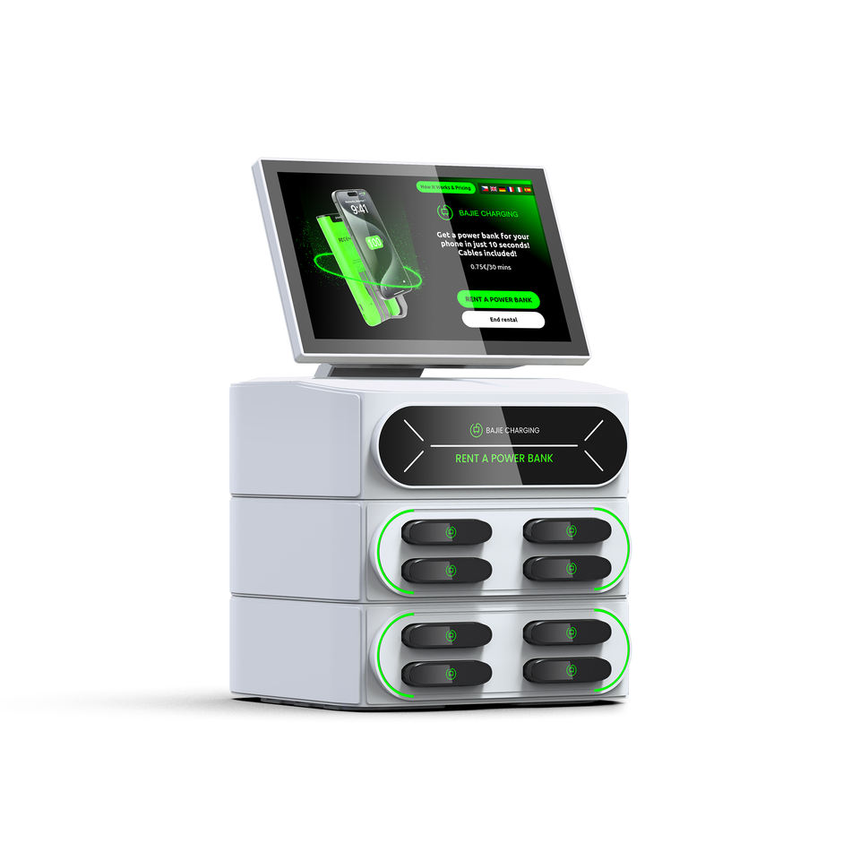 Station de recharge et de location de batteries externes partagées à 8 emplacements empilables avec écran tactile et système de point de vente intégré, borne de recharge multi-emplacements