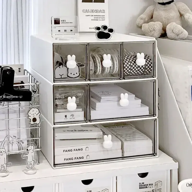 Boîte de rangement de bureau empilable pour la papeterie et le maquillage, organiseur de tiroir en plastique avec poignée en forme de lapin mignon