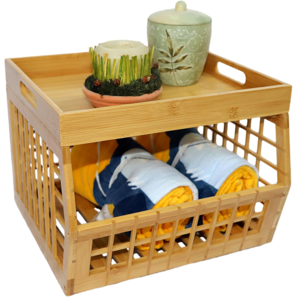 Plateau de service en bambou empilable ouvert à l'avant, couvercle rectangulaire, bac de rangement, seau, boîte en treillis pour l'organisation de l'entrepôt
