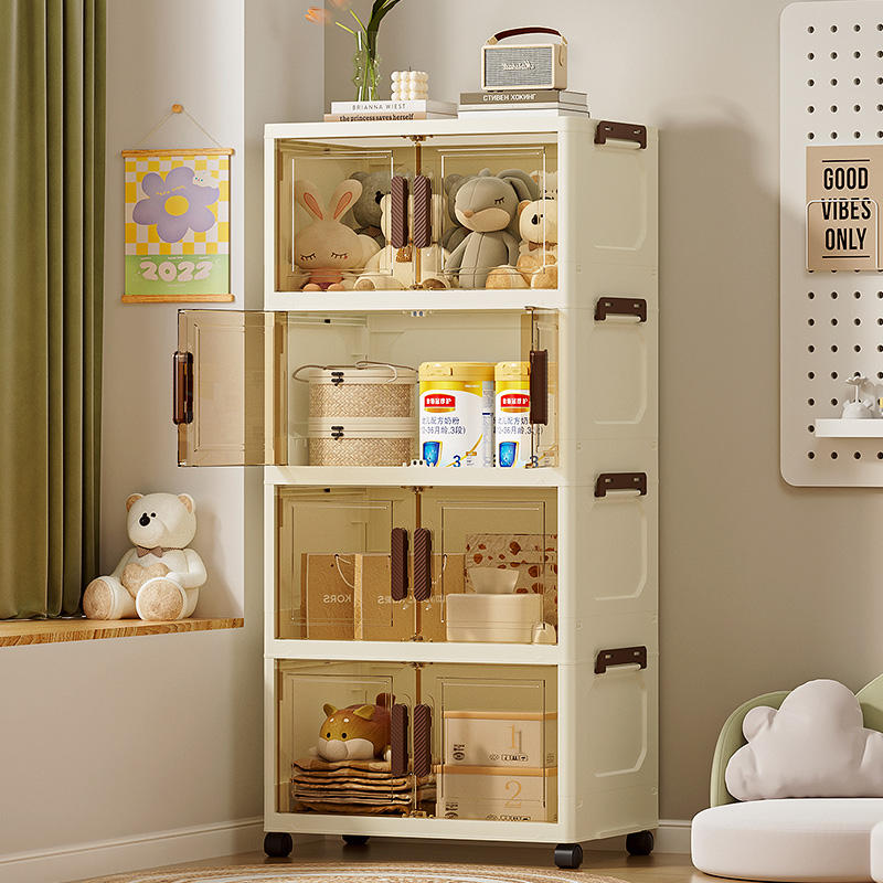 Armoire en plastique empilable avec porte coulissante transparente et roulettes pour usage domestique, armoire de rangement en plastique