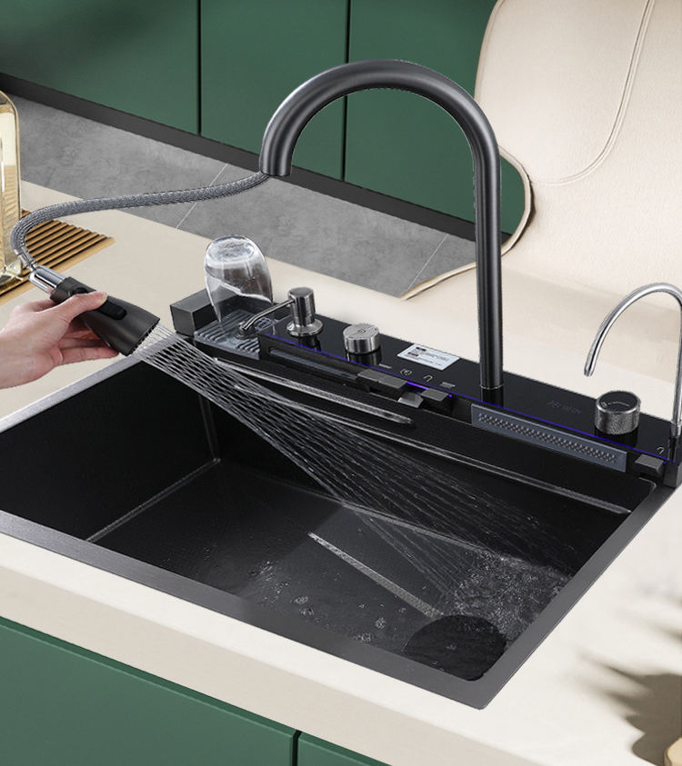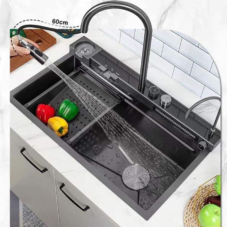 Évier de cuisine multifonctionnel en acier inoxydable 304 LED à affichage numérique avec deux bols rectangulaires et conception à un trou