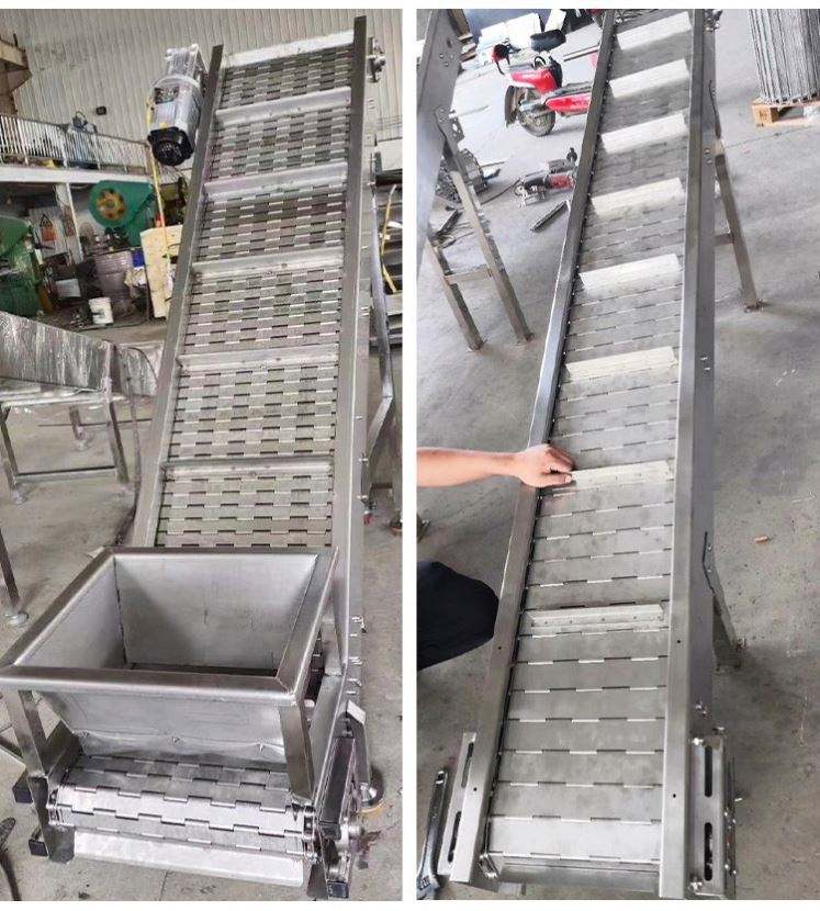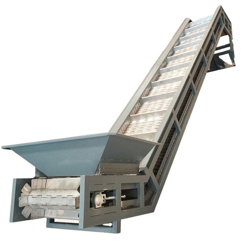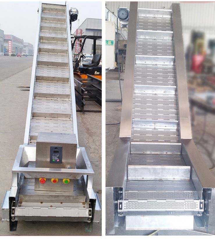 Élévateur à plaques en acier inoxydable pour le transport de copeaux et de matériaux, avec système de levage par chaîne