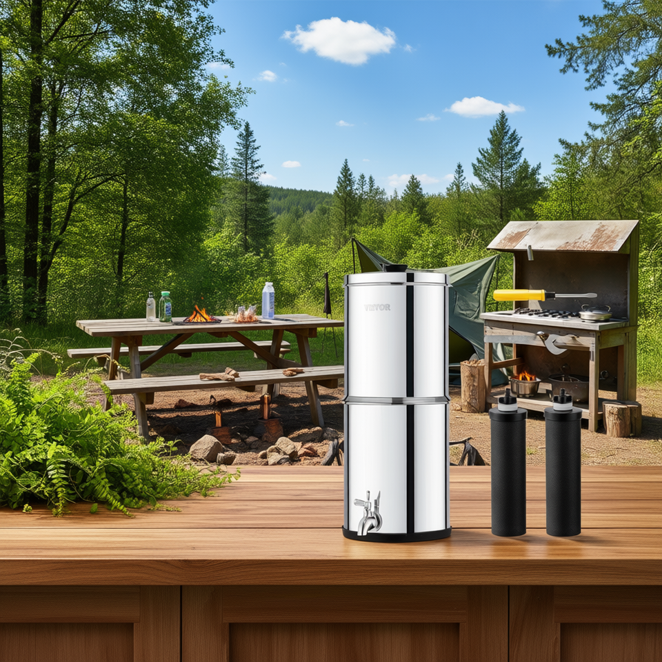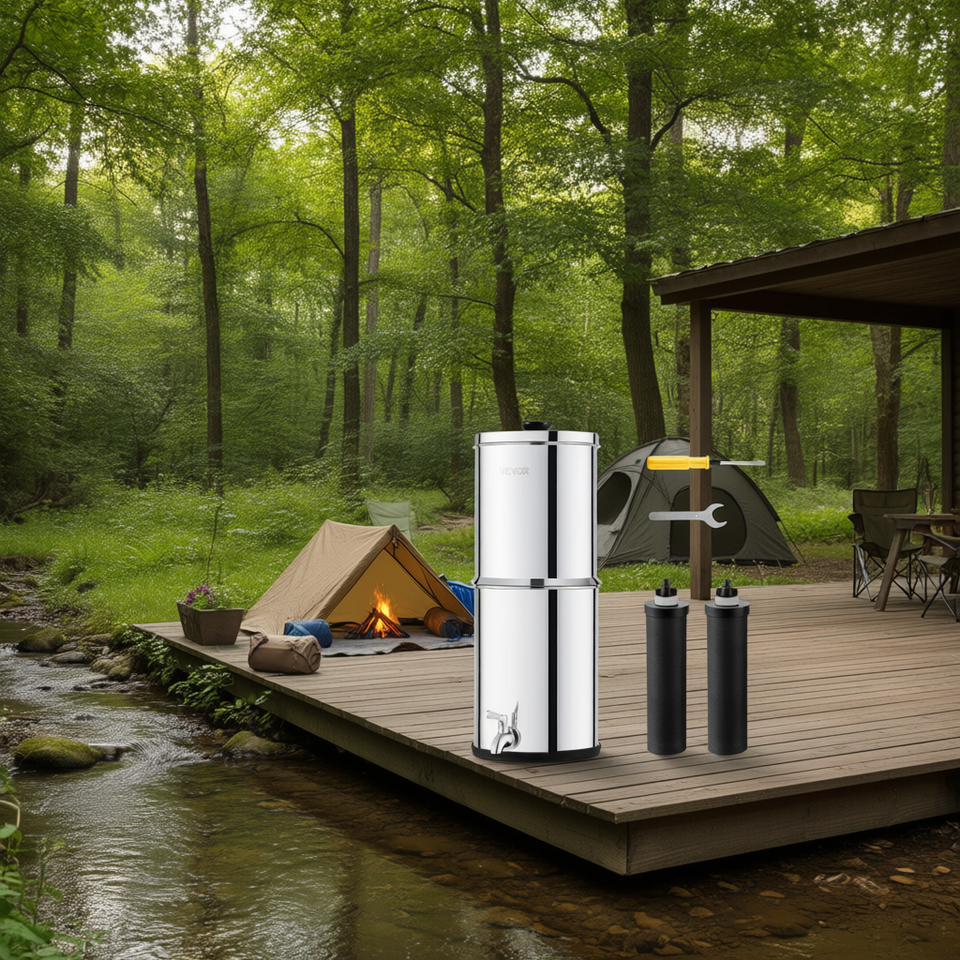 Filtre à eau de comptoir en acier inoxydable 2,25 gallons à alimentation par gravité avec 2 filtres à charbon actif pour usage extérieur
