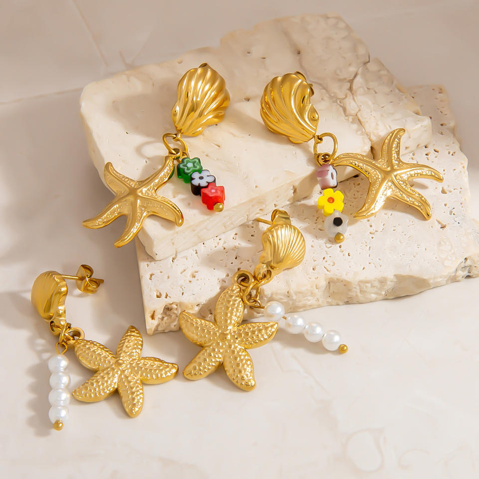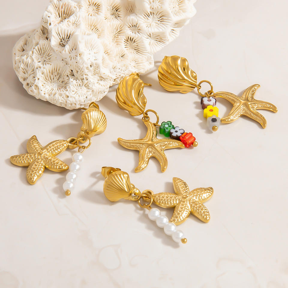 Boucles d'oreilles pendantes en acier inoxydable, thème océan, étoile de mer, coquillage, plaqué or, alliage de zinc, bijoux fantaisie EH11776