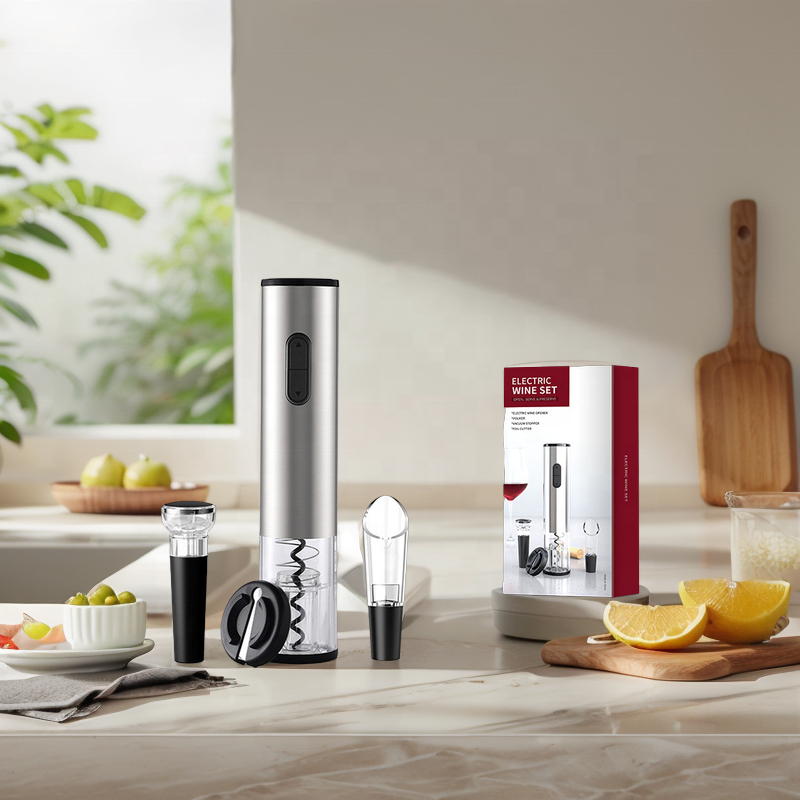 Package:1*Tin paper knife, 1*Wine pourer, 1*Airless cork, 1*Electric corkscrew