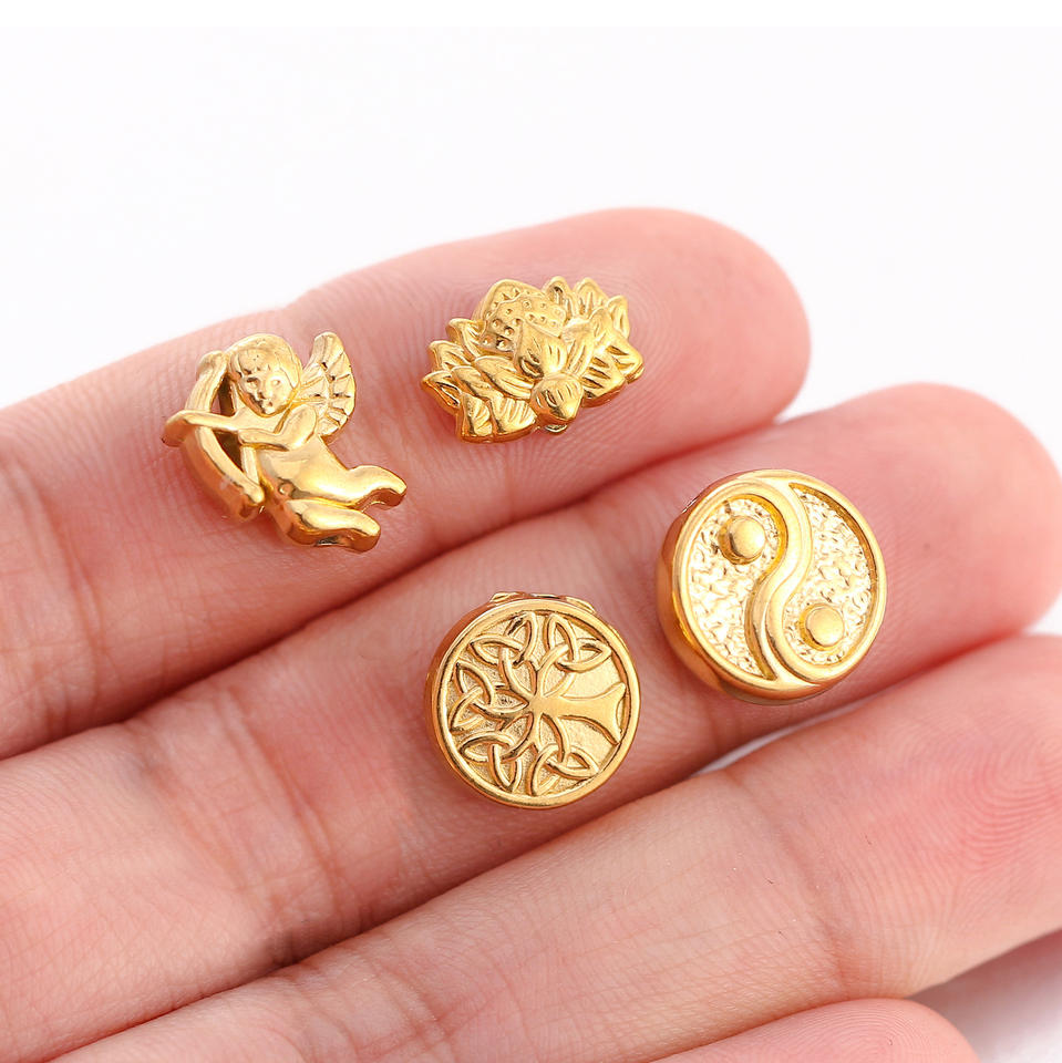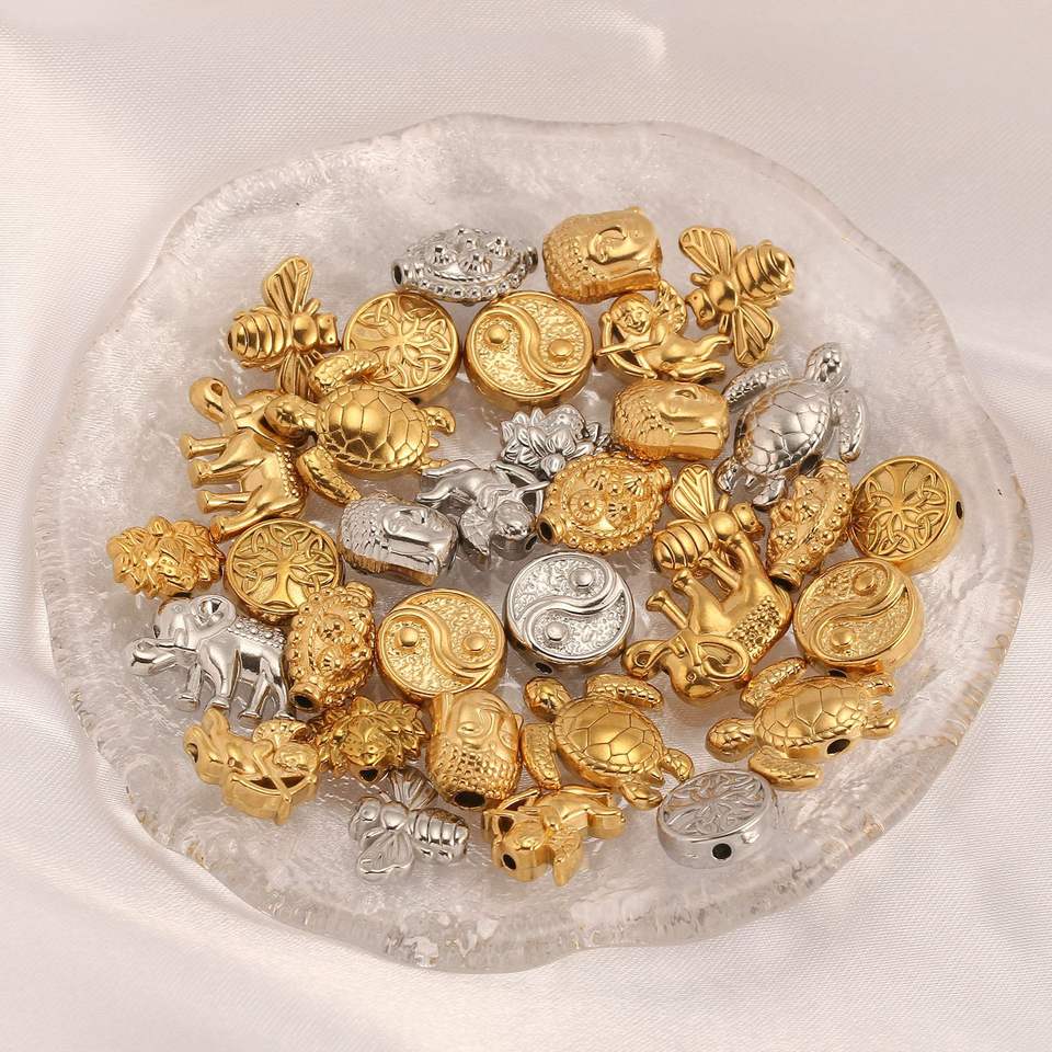 Acier inoxydable Éléphant Tortue Bouddha Tête Arbre de Vie Double Petit Trou Spacer Perle Yin Yang Ronde Perles Lâches