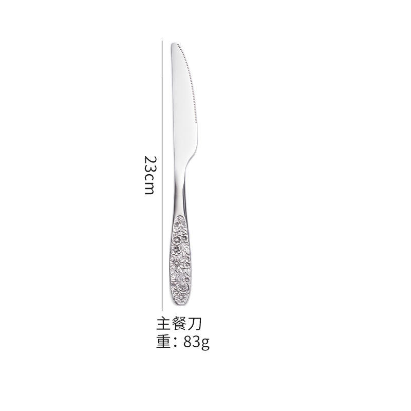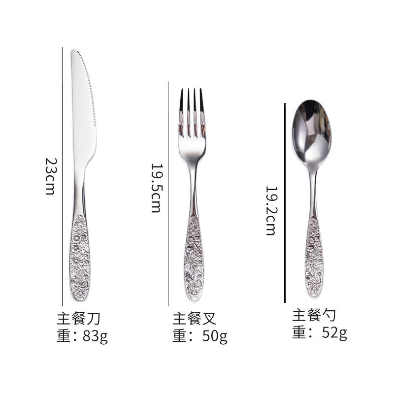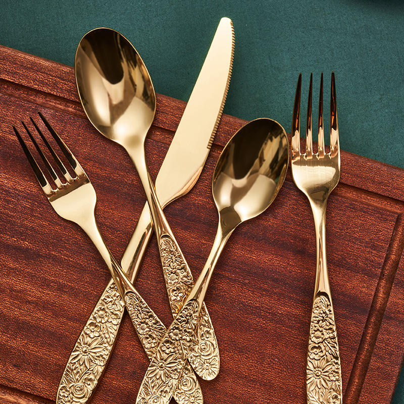 Ensemble de couteau, fourchette et cuillère en acier inoxydable, motif floral en relief, poli miroir, style rétro élégant, pour restaurant et hôtel