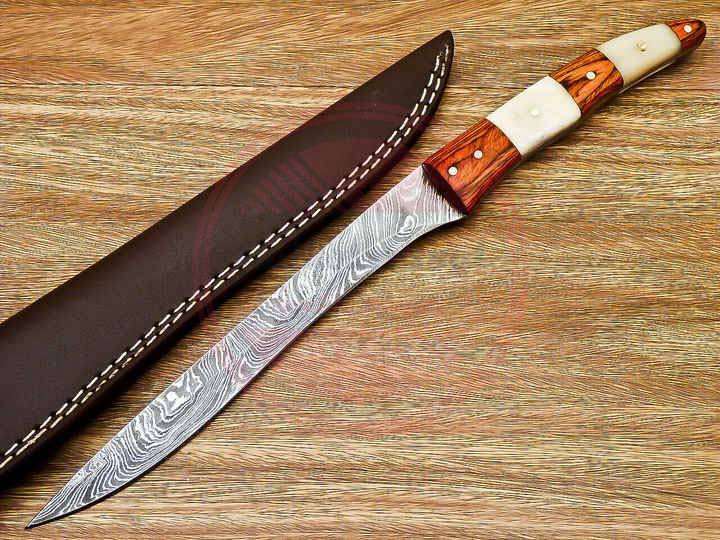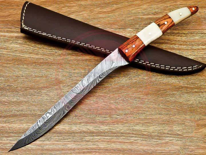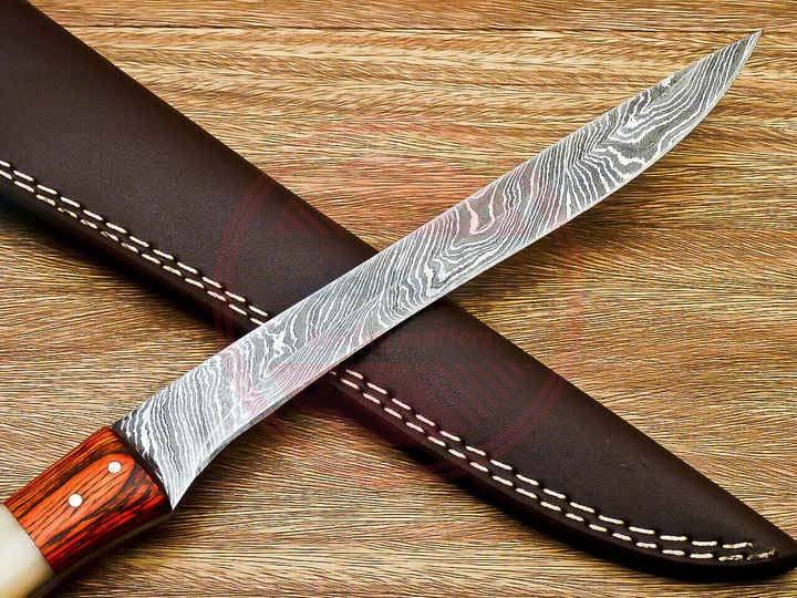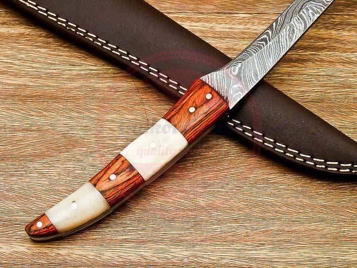 Couteau à filet en acier inoxydable à lame fixe fait à la main damas chasse pêche manche en bois avec étui en cuir pour la cuisine