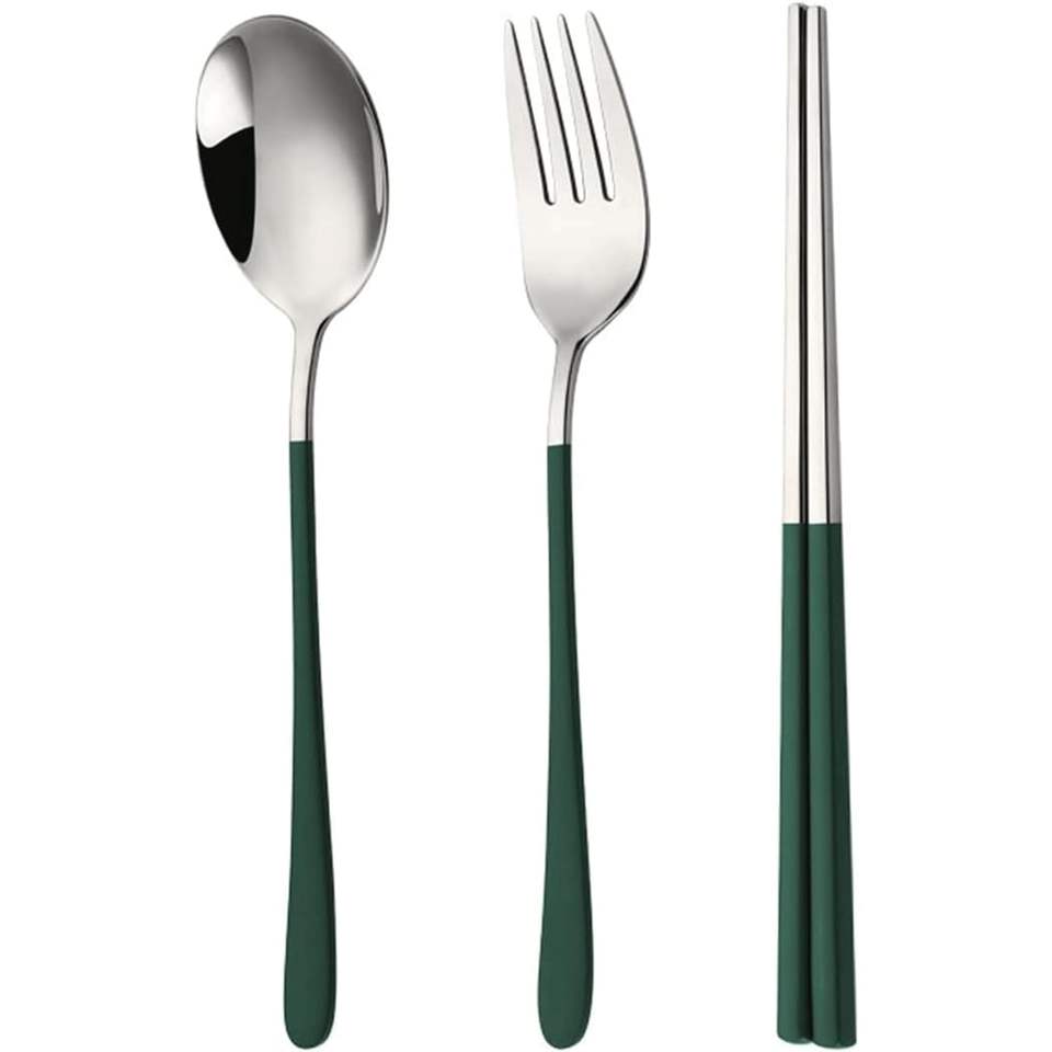 Couverts en acier inoxydable idéal ustensiles de cuisine café de table maison couleur argent plaqué couverts finis couleur verte poignée ensemble de 3