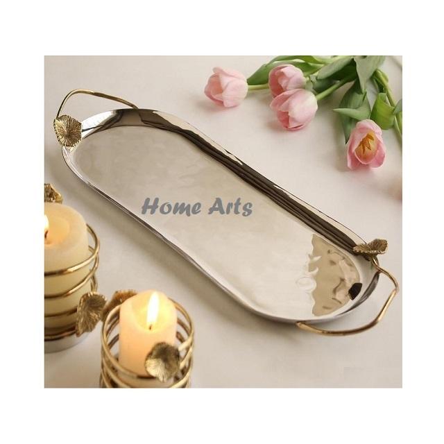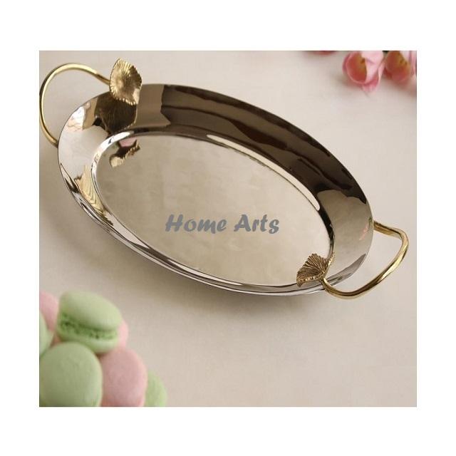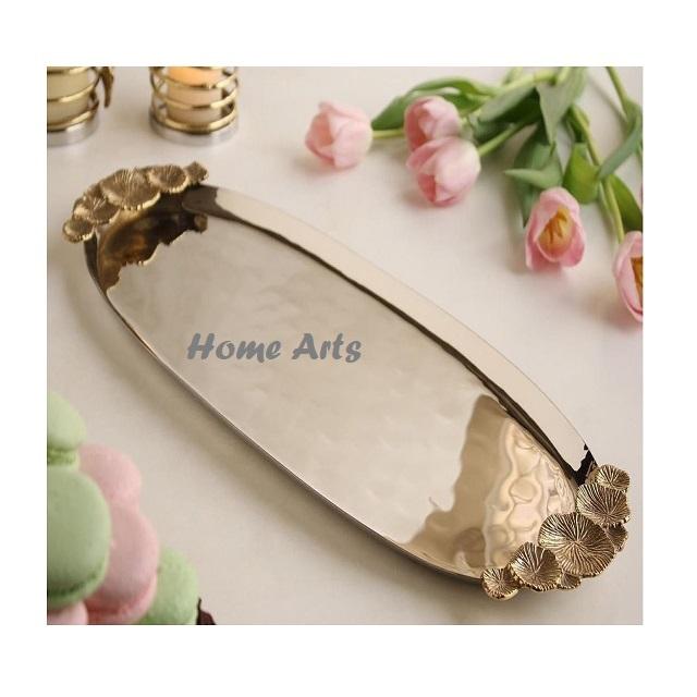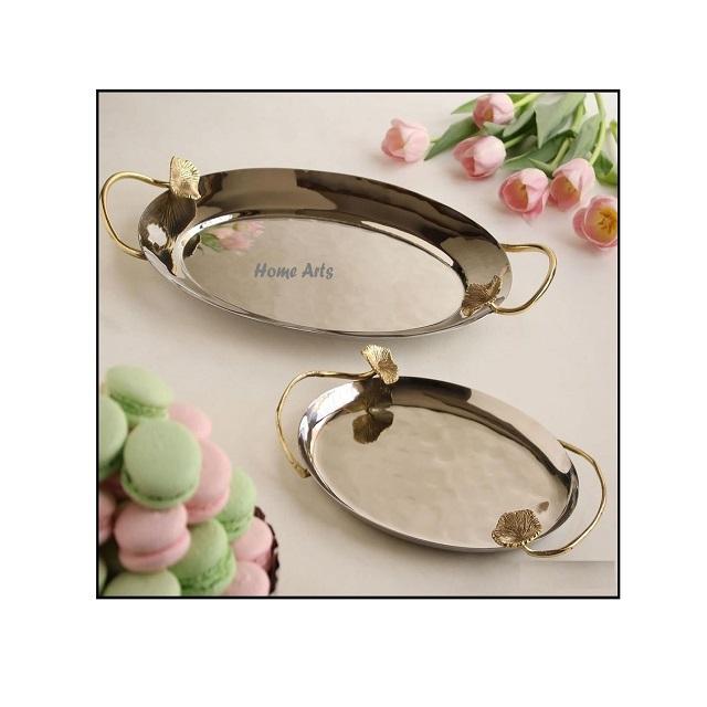 Plateau de service alimentaire en acier inoxydable avec poignée en forme de feuille, plateau de qualité supérieure pour chocolats et en-cas, best-seller