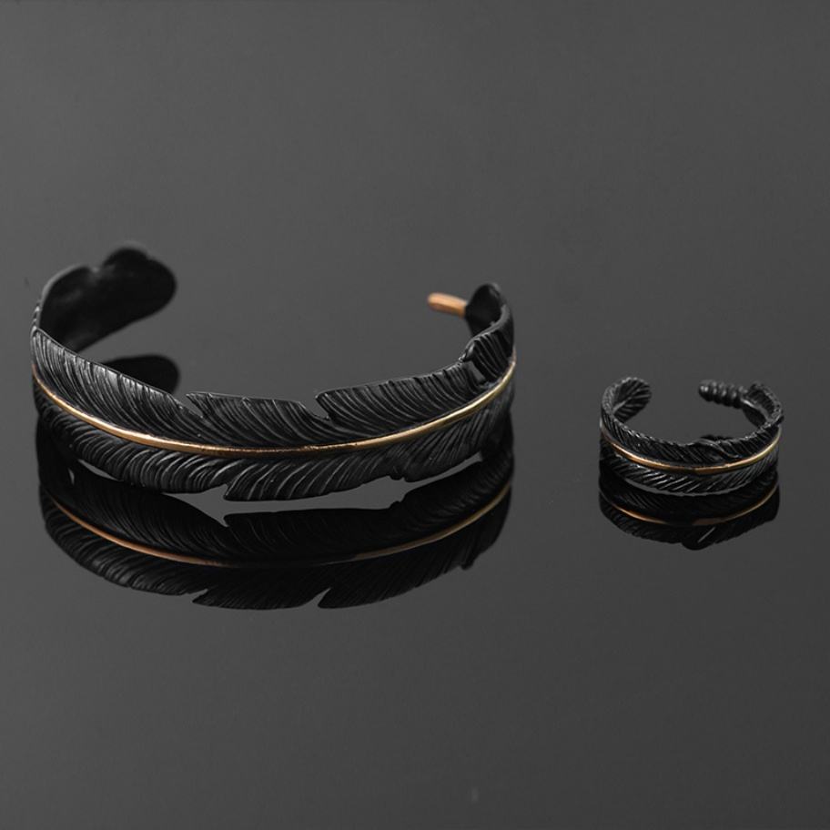 Ensemble de bijoux en acier inoxydable, bracelet ouvert réglable en argent, bracelet en forme de plume pour homme et femme, bijoux classiques, cadeau