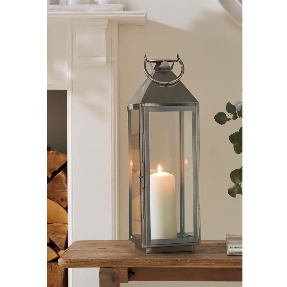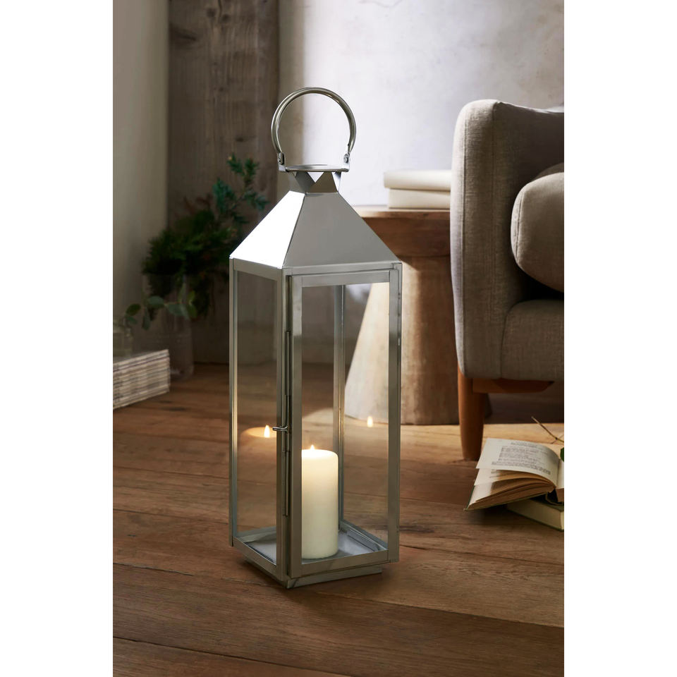 Lanterne en acier, métal et verre pour décorations de sol Lanterne suspendue à bougie en acier inoxydable argenté de haute qualité Best-seller