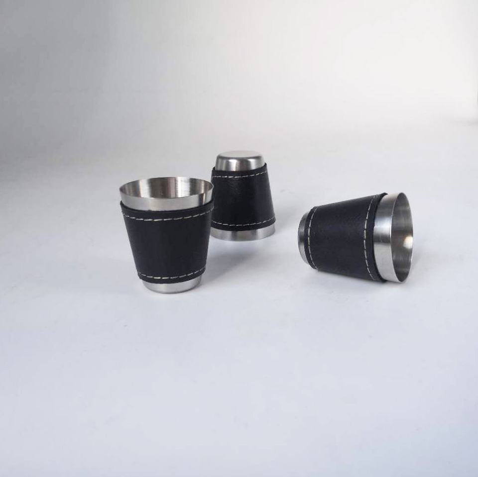 Mini verre à vin en acier inoxydable avec étui en cuir noir, tasse à boire portable, petit verre à shot en métal, vente en gros