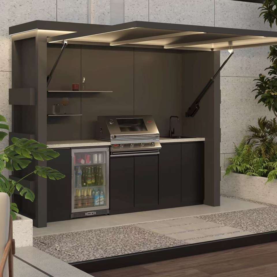 Abri de cuisine extérieur en acier inoxydable avec résistance au vent et à la pluie, équipé d'un évier et d'un réfrigérateur