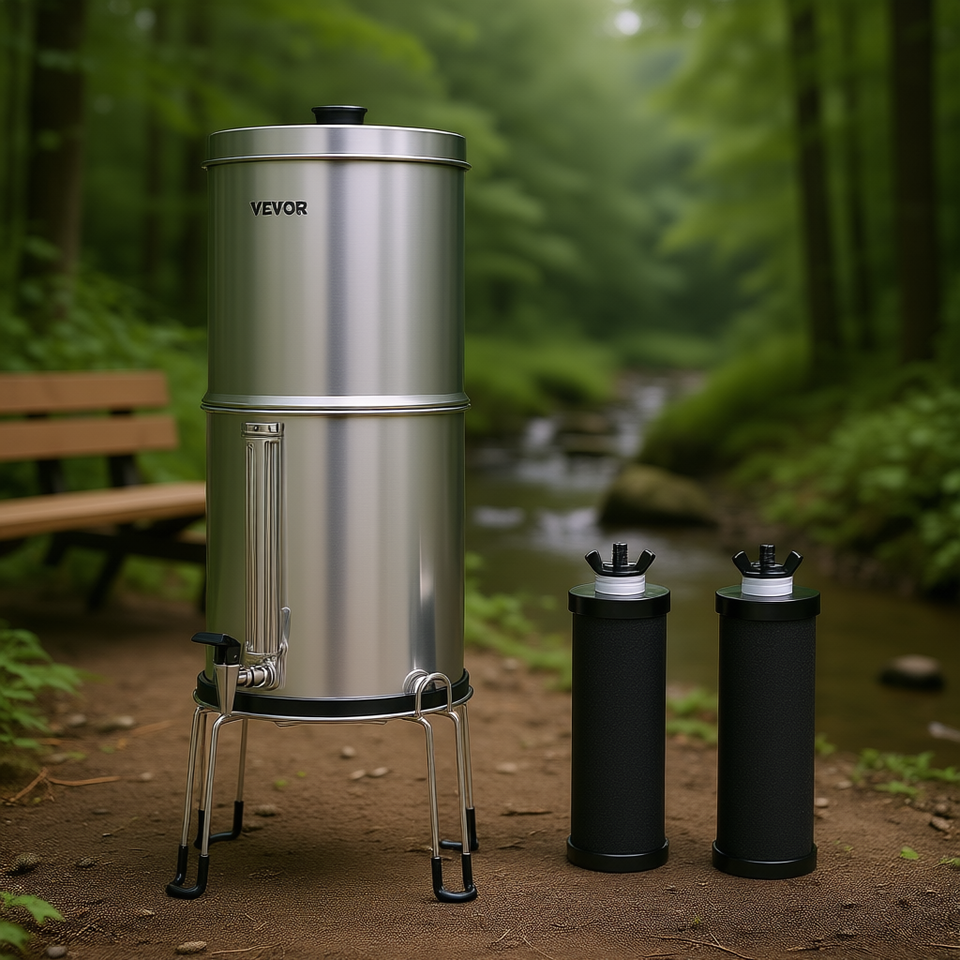 Système de filtration d'eau extérieur en acier inoxydable 2,25 gallons à alimentation par gravité avec 2 filtres pour le camping et la randonnée