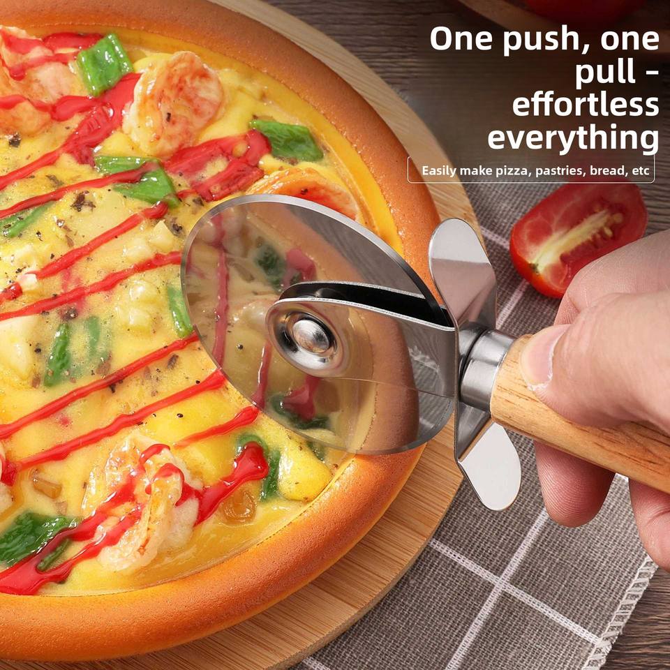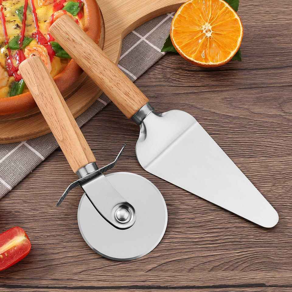 Spatule à pizza en acier inoxydable et coupe-pizza triangulaire à roulettes avec manche en bois