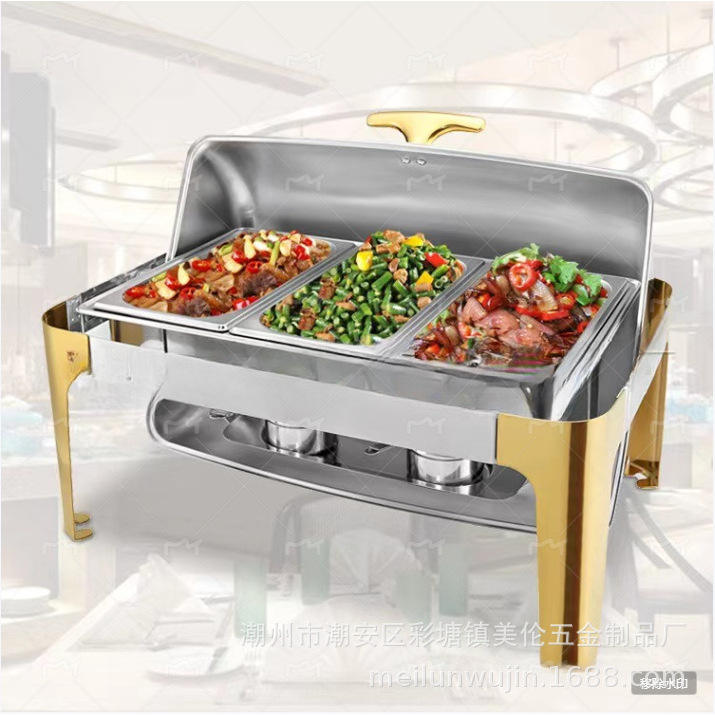 Réchaud rectangulaire en acier inoxydable couleur or avec couvercle rabattable pour hôtels et traiteurs