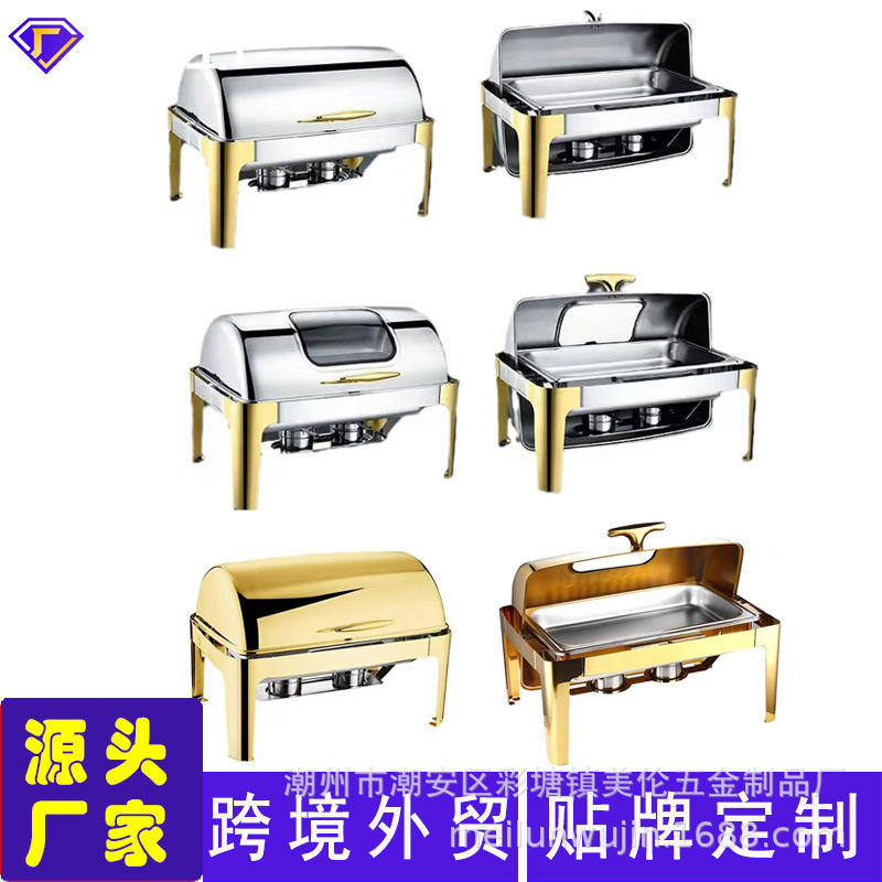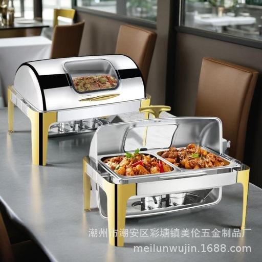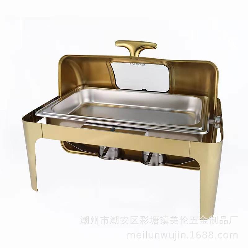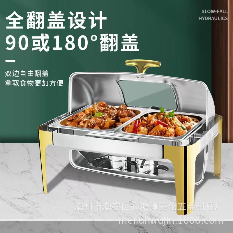 Réchaud rectangulaire en acier inoxydable avec couvercle rabattable et chauffage à l'alcool pour hôtels et traiteurs