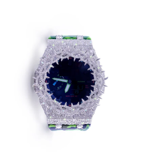 Boîtier rond en acier inoxydable avec lunette à pointes de diamant, bracelet camouflage vert, cadran en verre, résistance à l'eau 10 bars