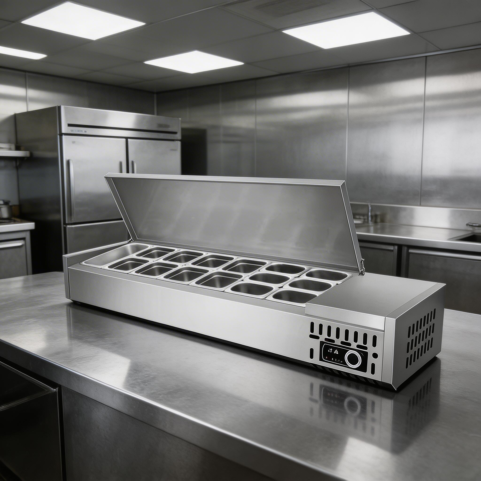 Table de préparation de salades en acier inoxydable avec vitrine réfrigérée à compresseur pour usage commercial