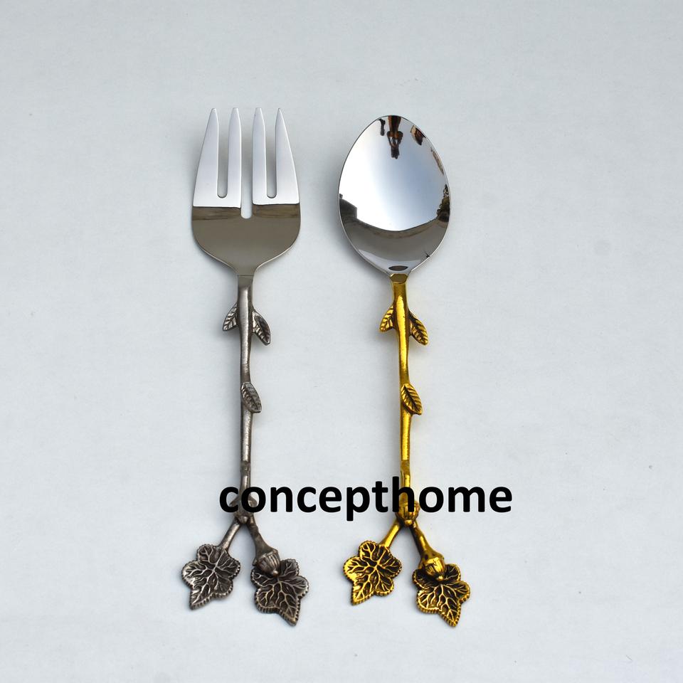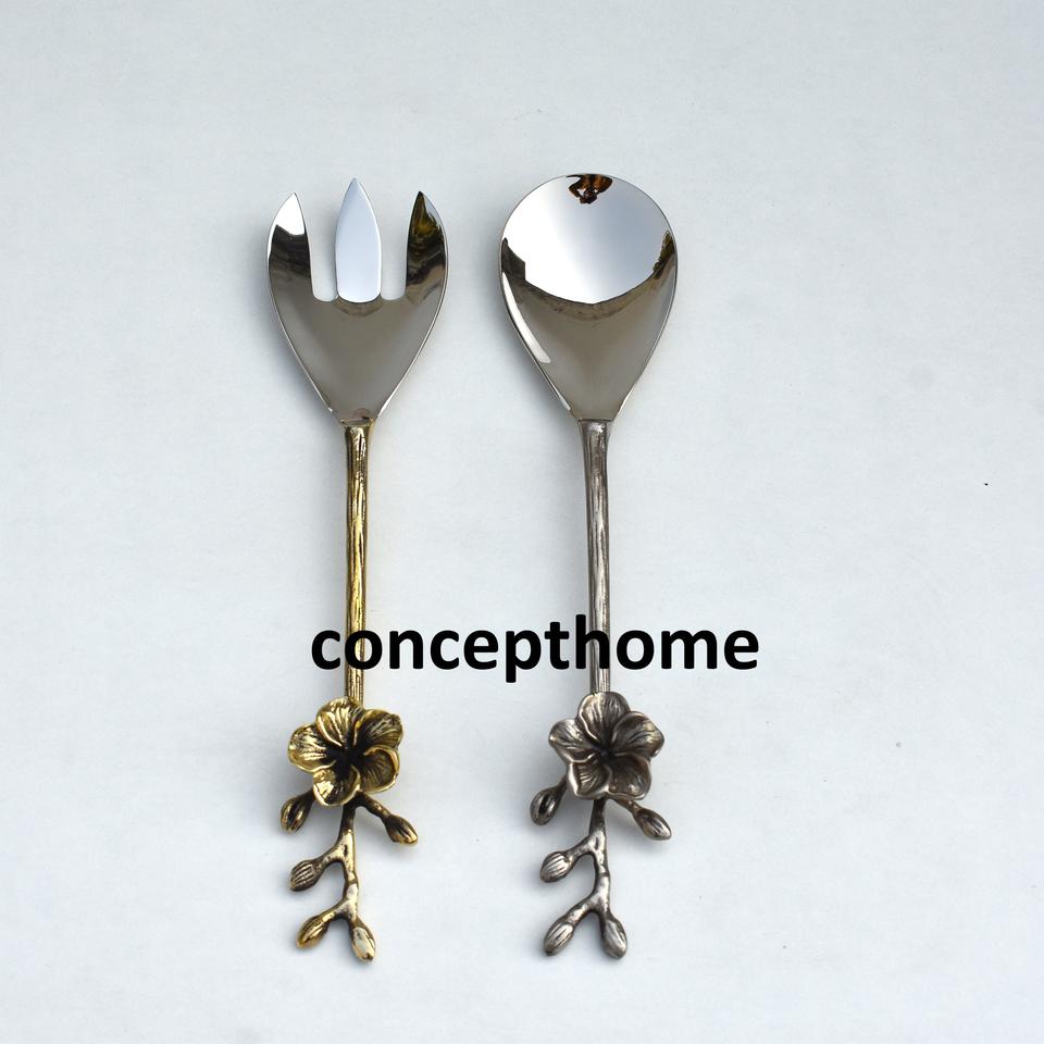 Ensemble de serveurs à salade de luxe en acier inoxydable, finition miroir, moderne, élégant, unique, avec manche en métal en forme de branche