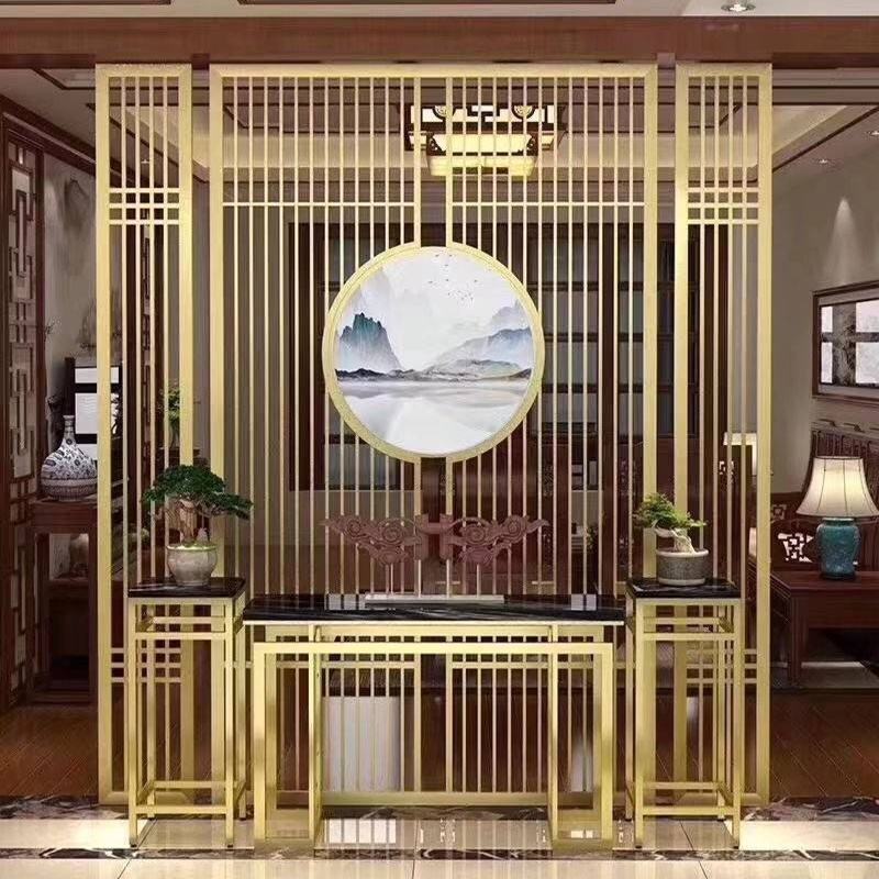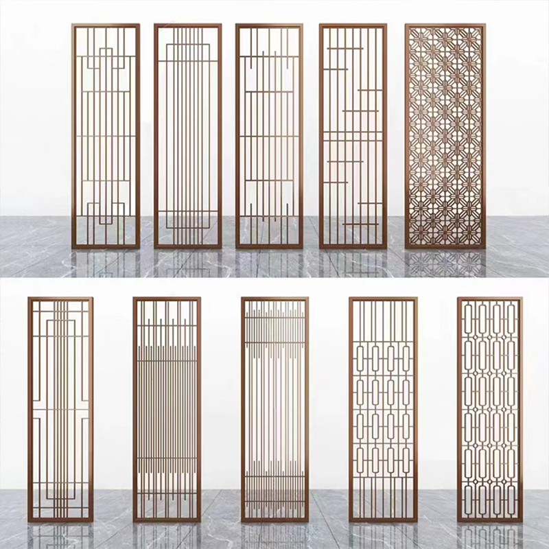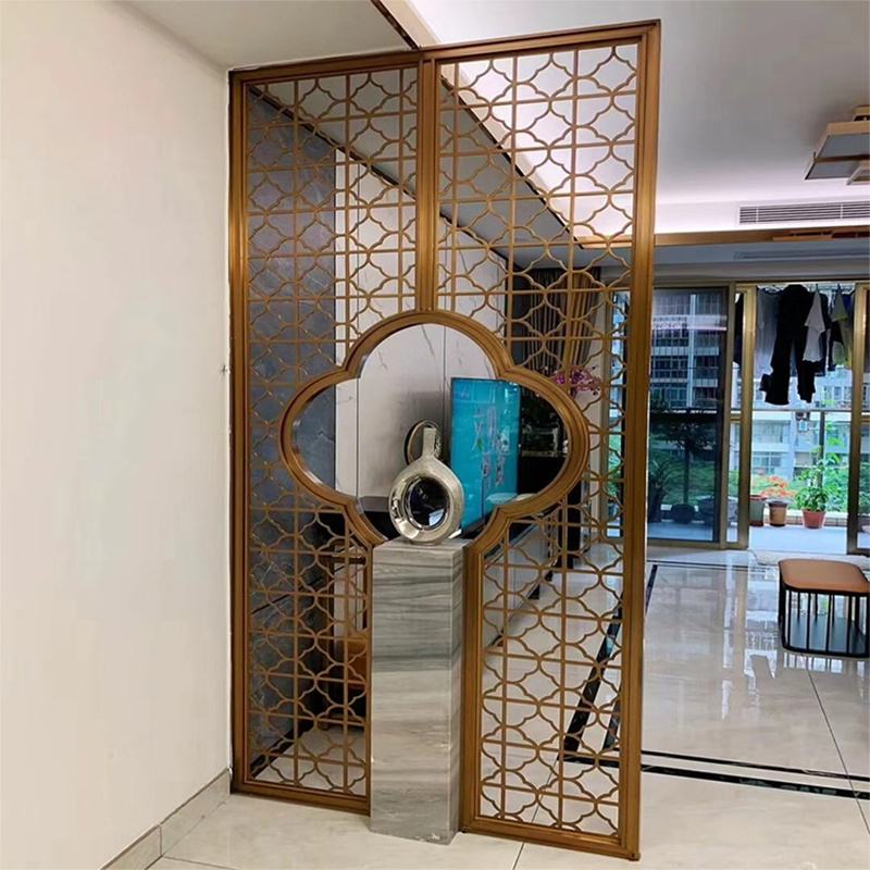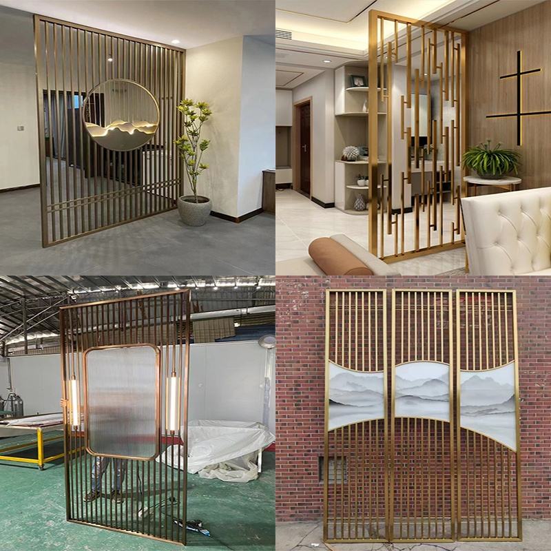 Cloison écran en acier inoxydable or rose brossé entrée métal creux lumière luxe salon verre rideaux cantonnières panneau