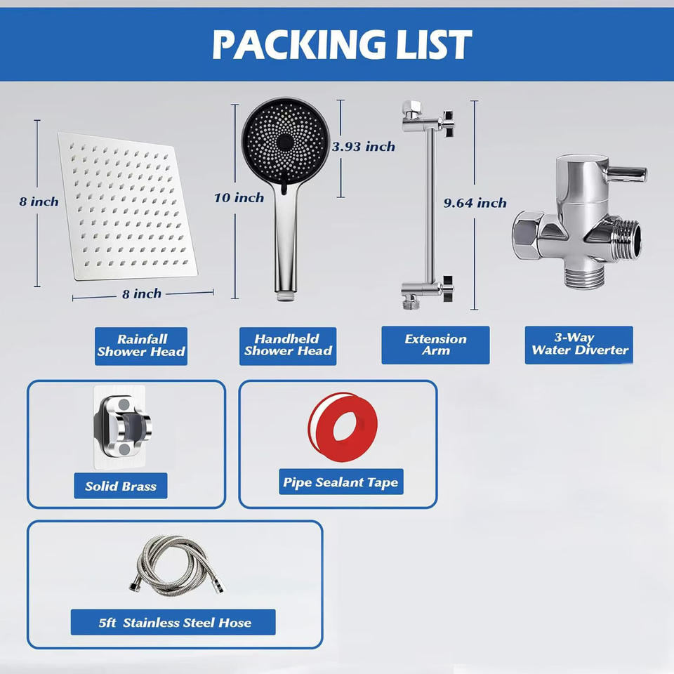 Ensemble de douche en acier inoxydable avec pommeau de pluie carré et douchette à main 3 vitesses, finition chromée anti-corrosion