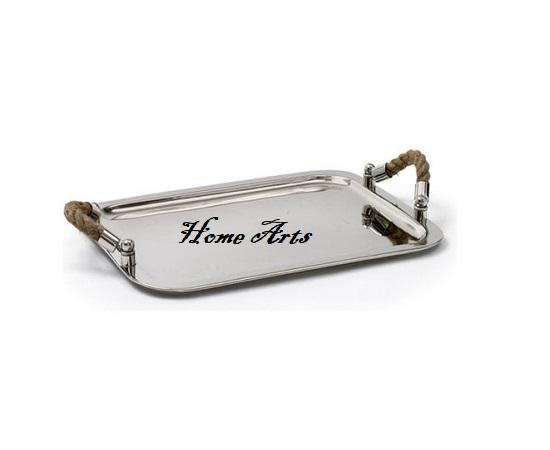 Plateau de service en acier inoxydable de couleur argentée avec plateau de service de thé et café de la plus haute qualité avec poignées en corde