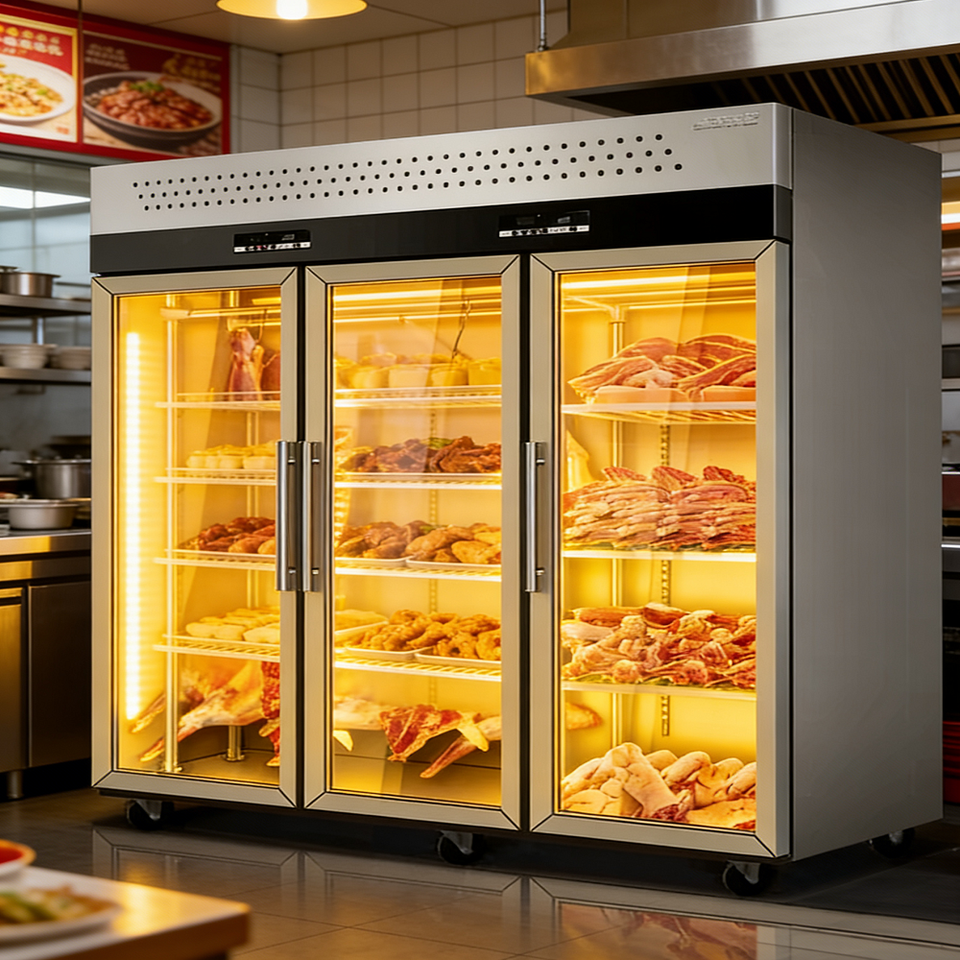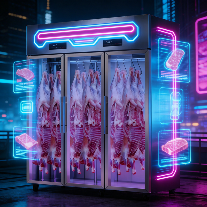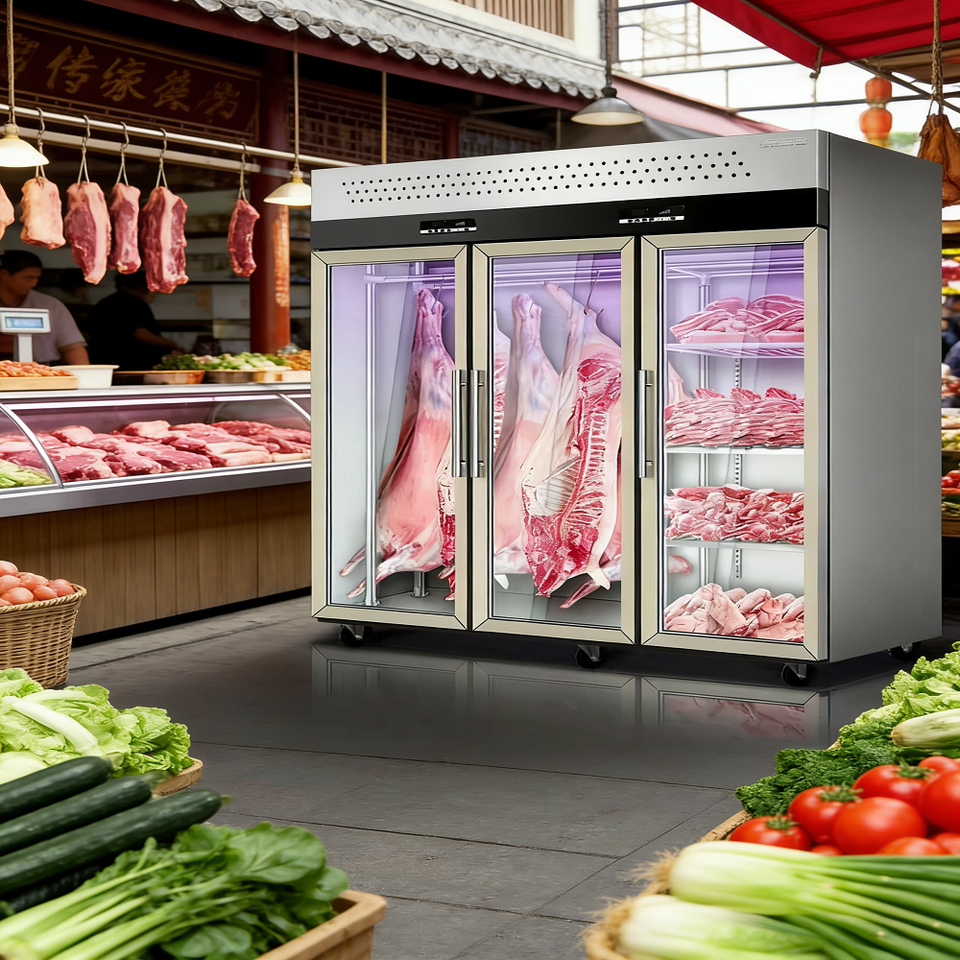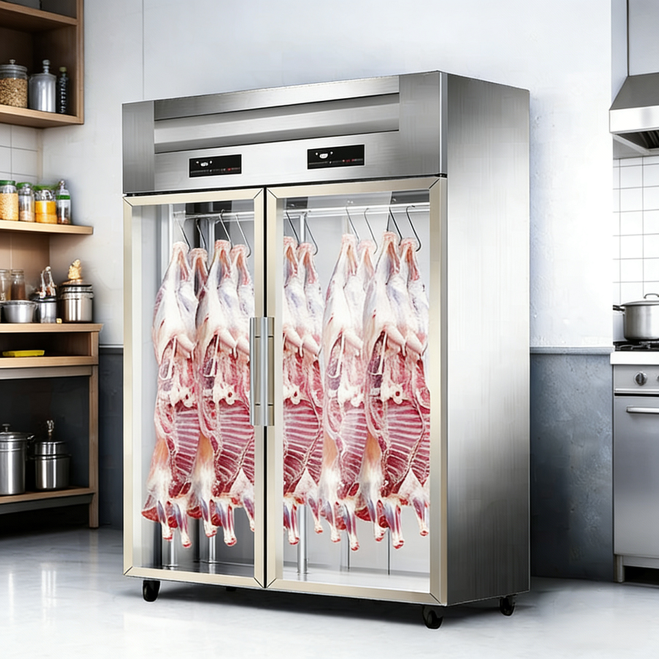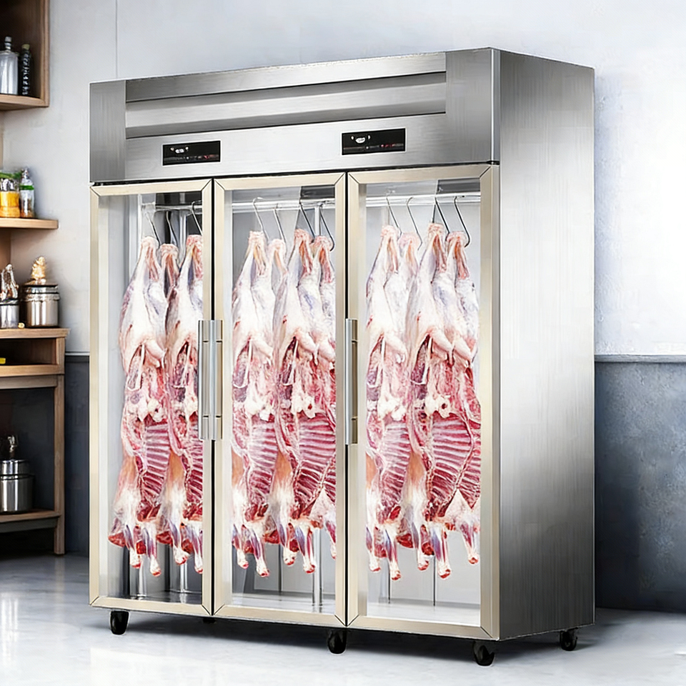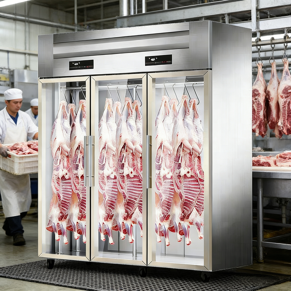 Réfrigérateur commercial à température unique en acier inoxydable pour boucheries Crochets suspendus Étagères en verre Refroidissement direct