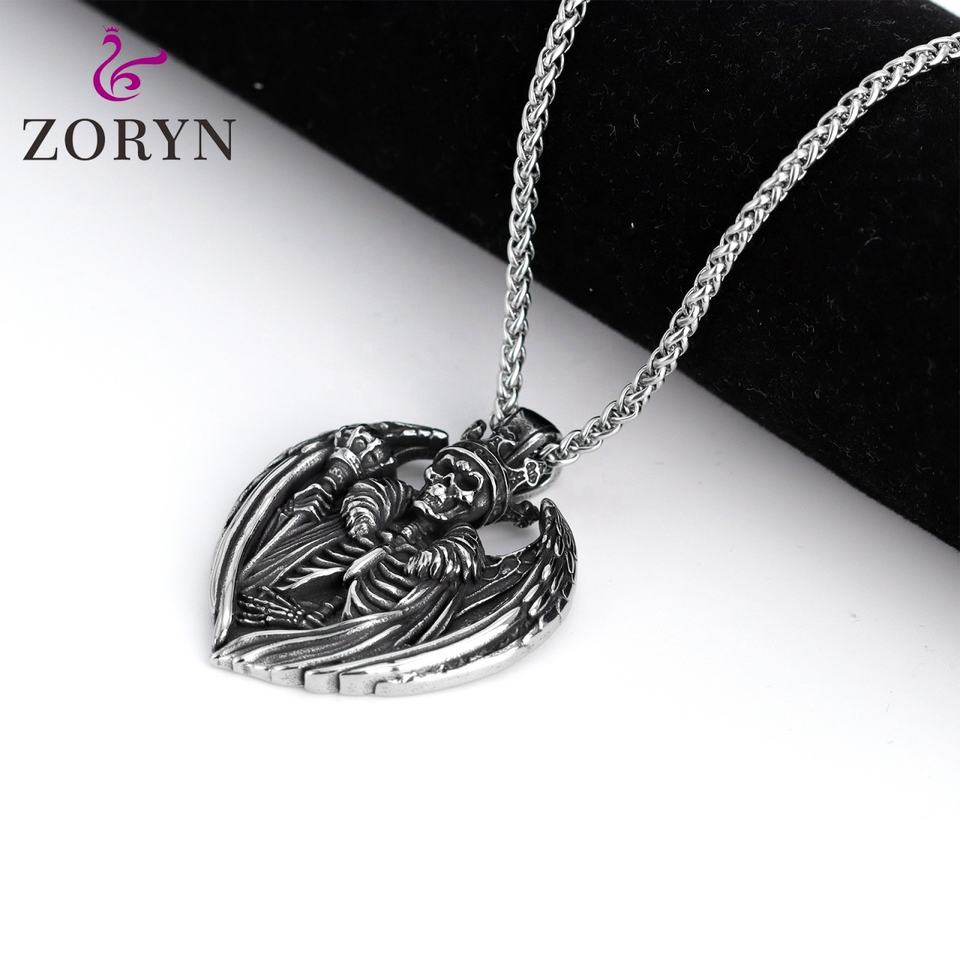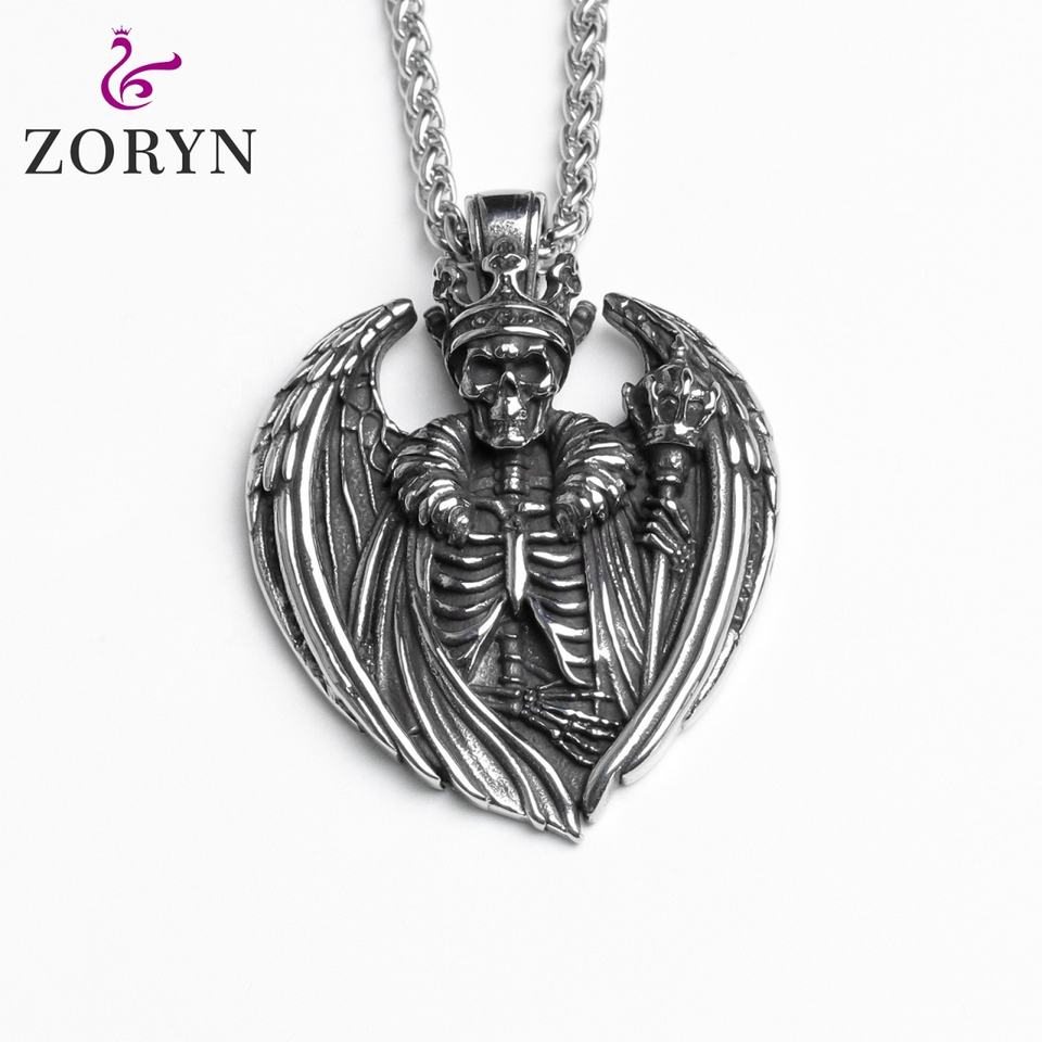 Pendentif Cœur Aile de Roi Squelette en Acier Inoxydable, Couronne Sceptre Gothique Punk Vintage en Acier Titane, Bijoux de Mode pour Hommes