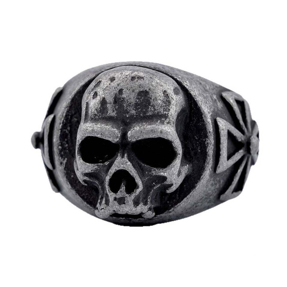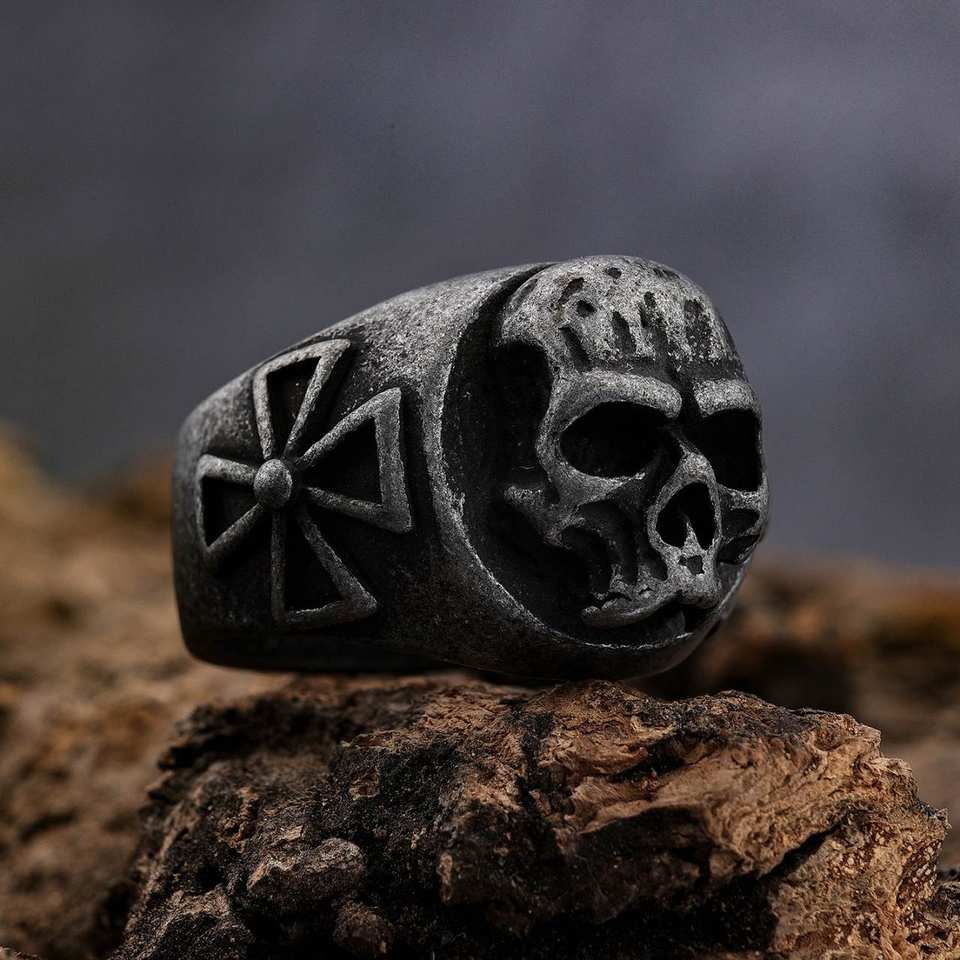 Bague Chevalière Crâne en Acier Inoxydable Finition Noire Oxydée Style Gothique Motard Détail Croix Argenté pour Hommes Bijou Étanche