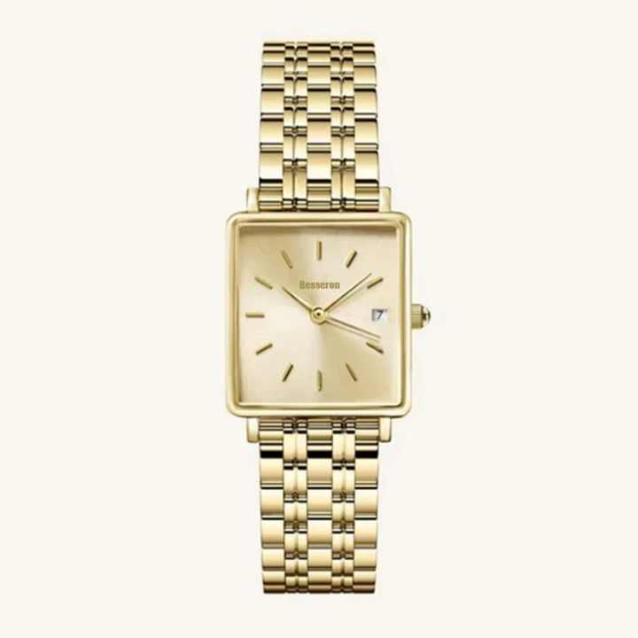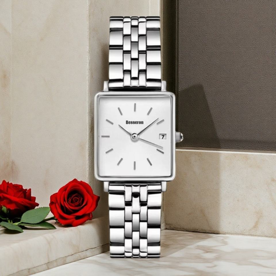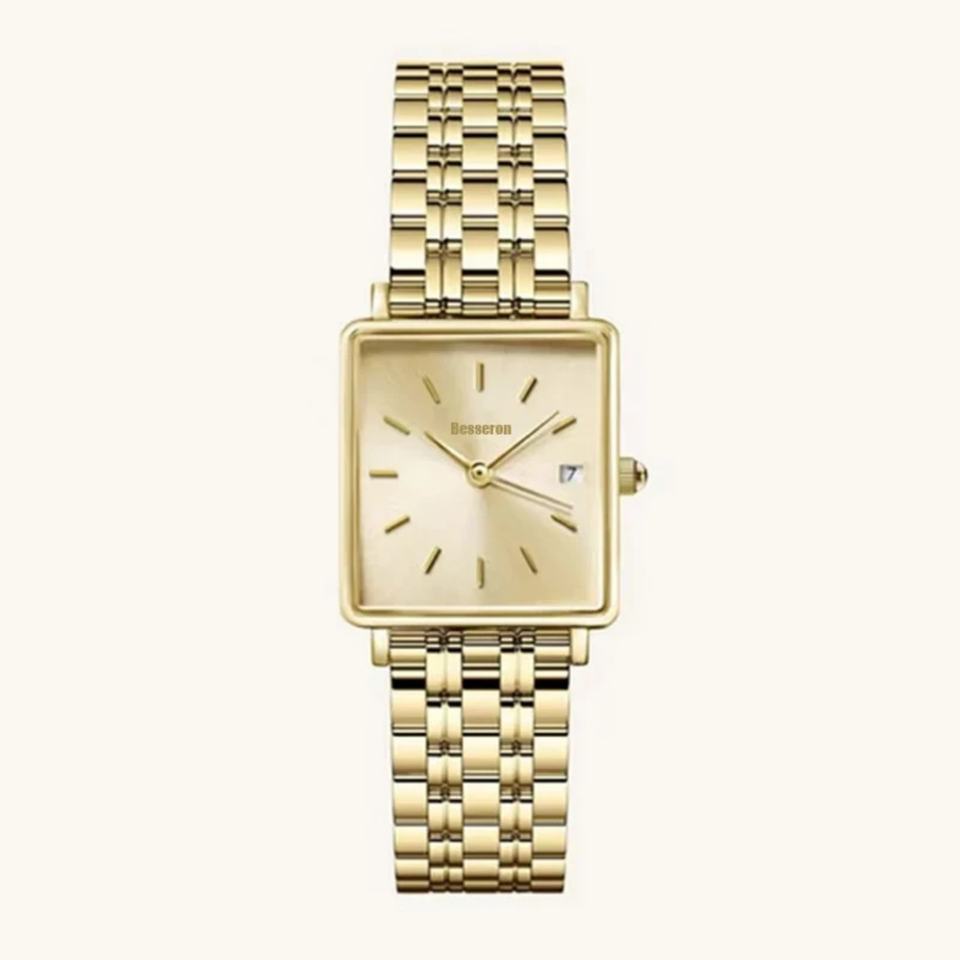 Montre à quartz pour femme avec boîtier carré en acier inoxydable, bracelet en cuir, résistante à l'eau 3BAR, style business, cadran analogique, luxe